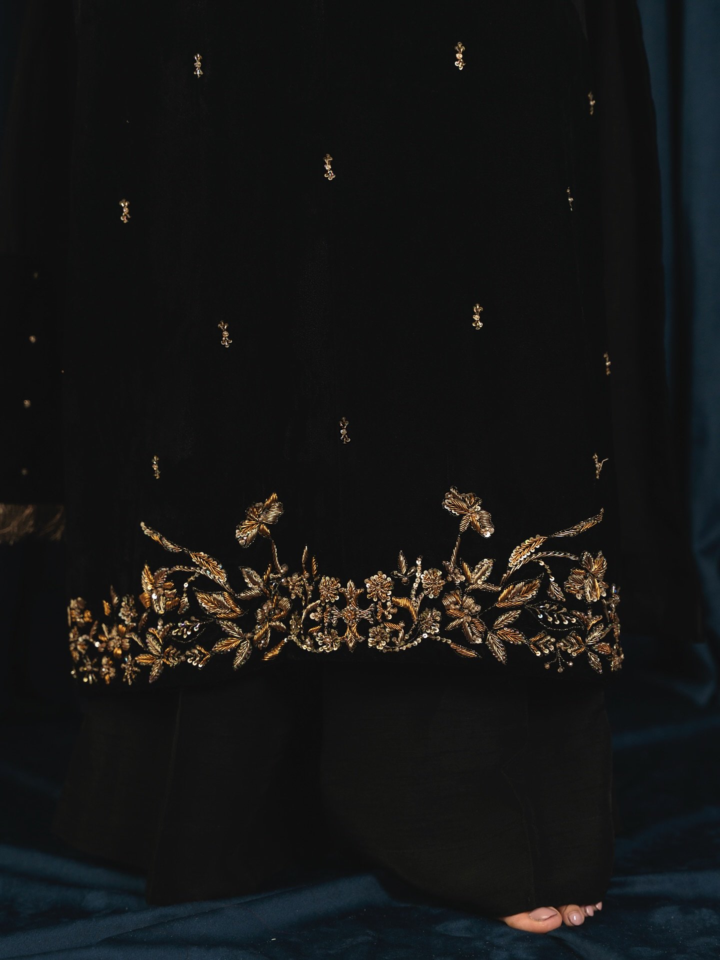 Stole/Shawl Matching/Coordinating Dupatta: While not fully visible, a matching velvet or net dupatta with gold trim or scattered motifs would complete the look.