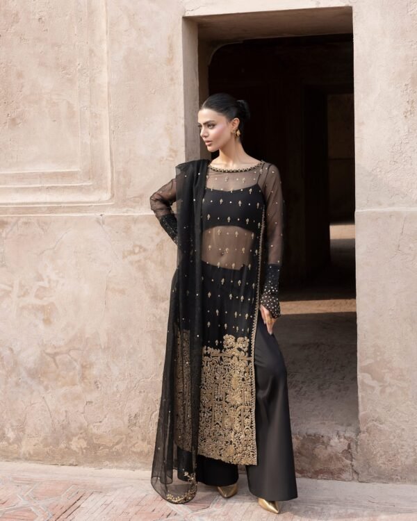A striking black organza ensemble adorned with intricate antique gold embellishments and delicate detailing. Paired with azar trousers and a sheer dupatta — an ode to timeless festive grace.