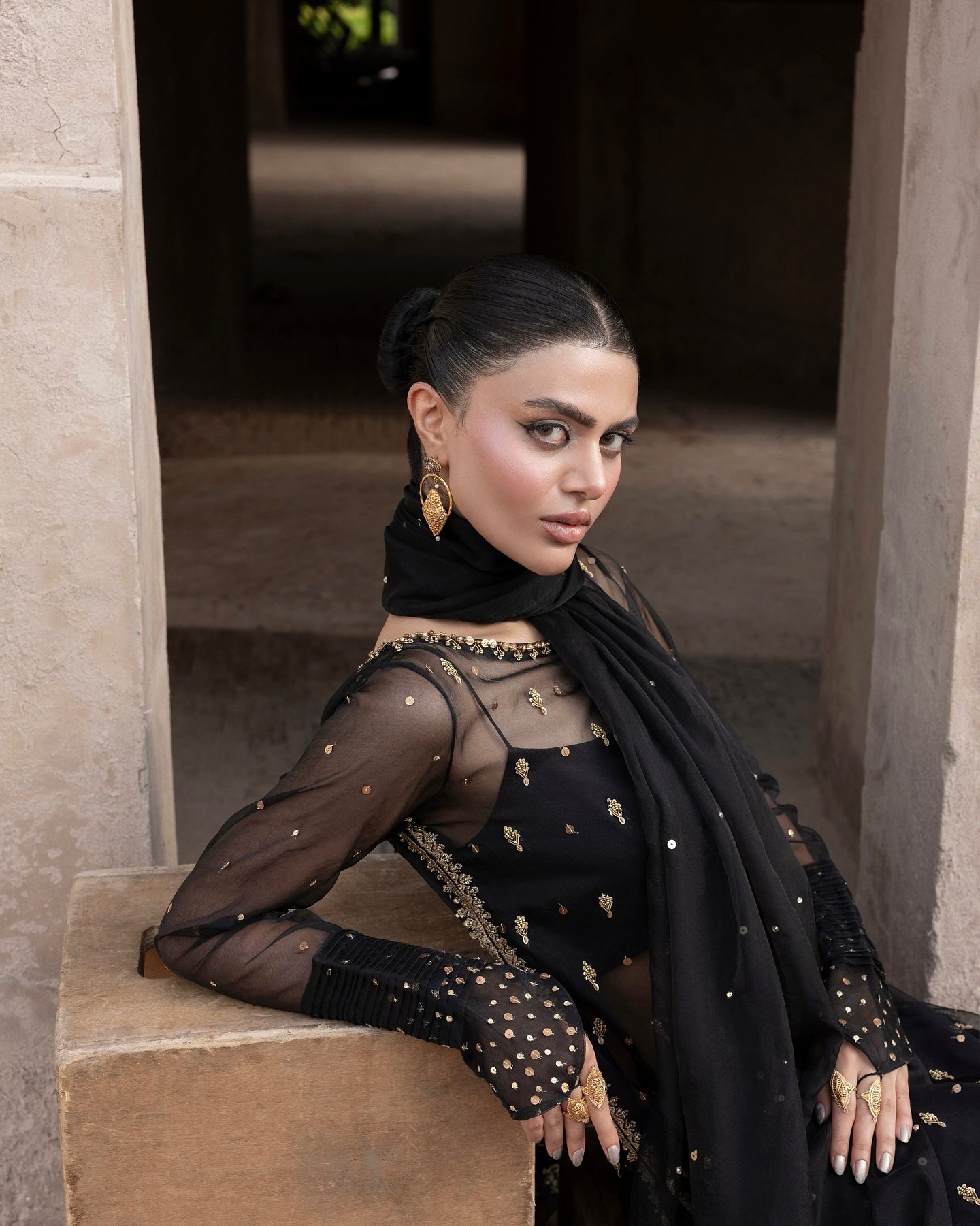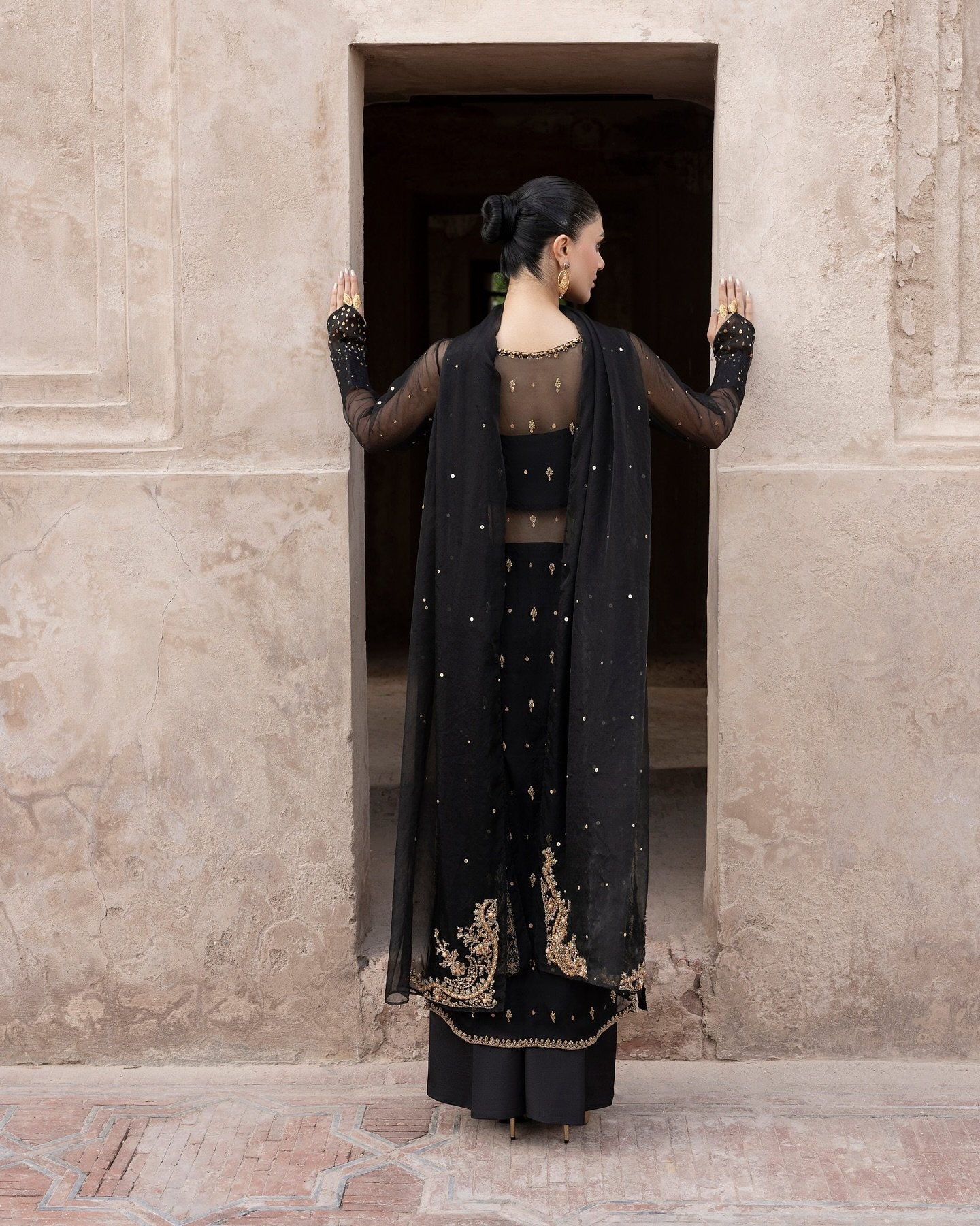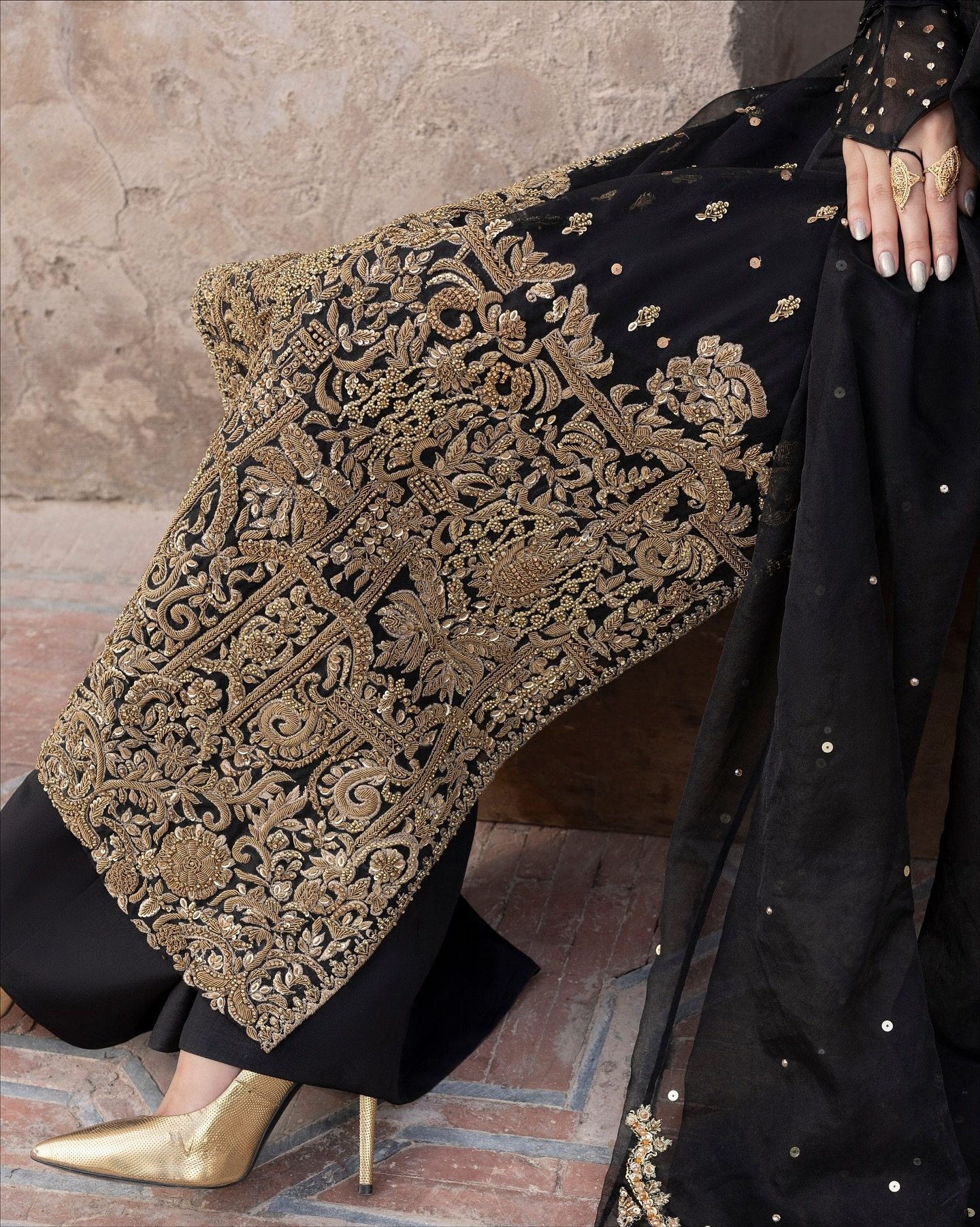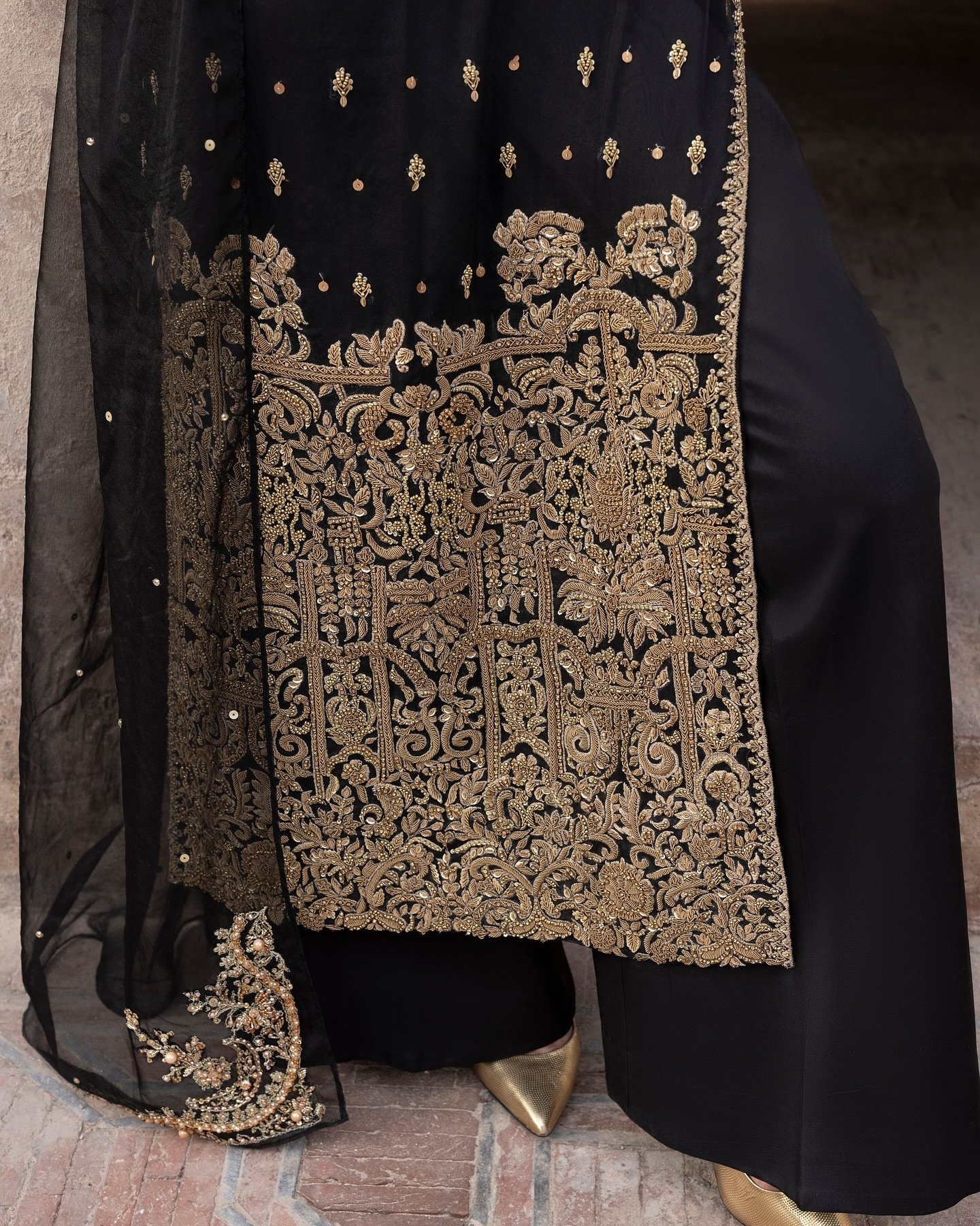A striking black organza ensemble adorned with intricate antique gold embellishments and delicate detailing. Paired with azar trousers and a sheer dupatta — an ode to timeless festive grace.