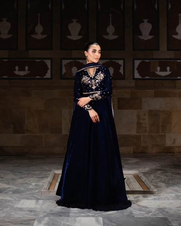 DINAH, the deep navy velvet peshwas comes with a delicately hand-worked bodice and sleeves with velvet panels, a crushed silk lehnga and a gold detailed silk dupatta.
