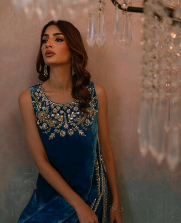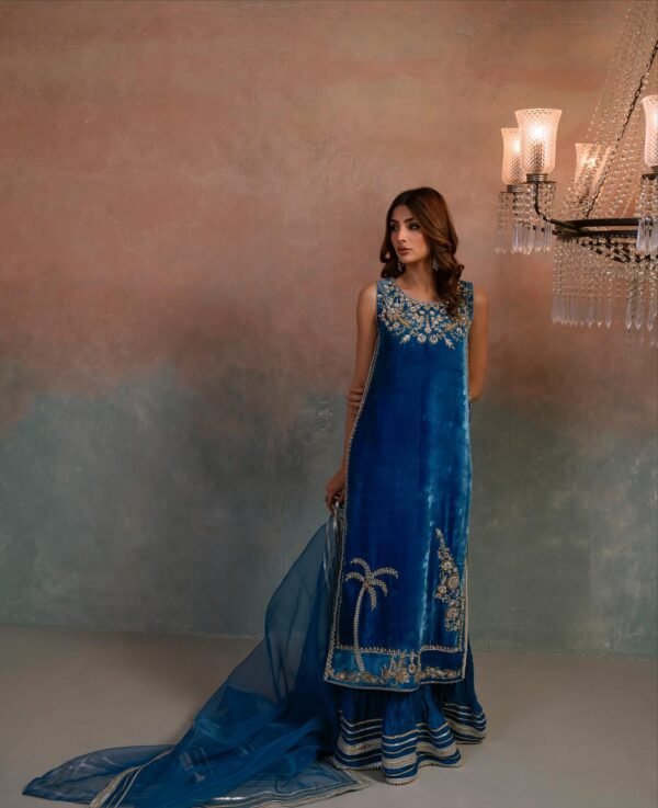 A bright turquoise shade of velvet handcrafted in gold zardozi pearls and diamantés on a straight long silhouette. Comes with a gota detailed sharara pants and organza dupatta.