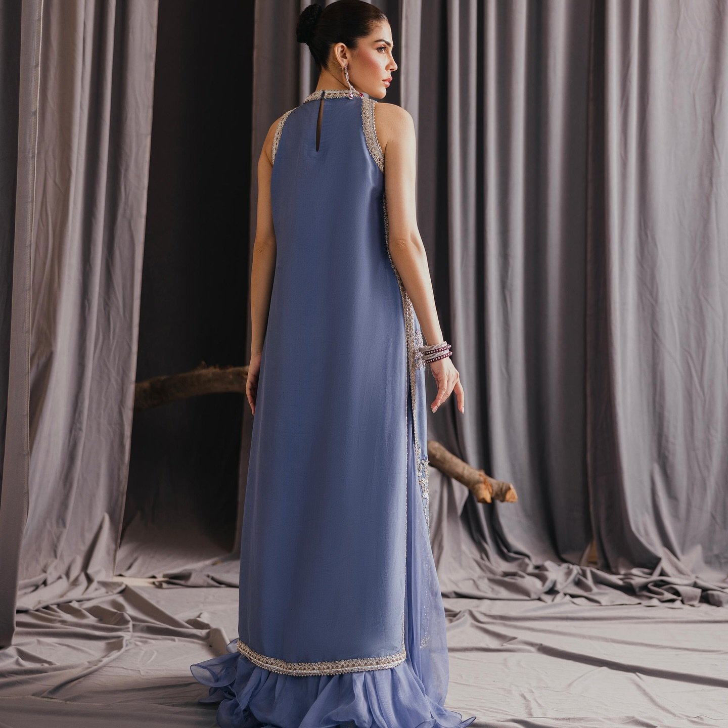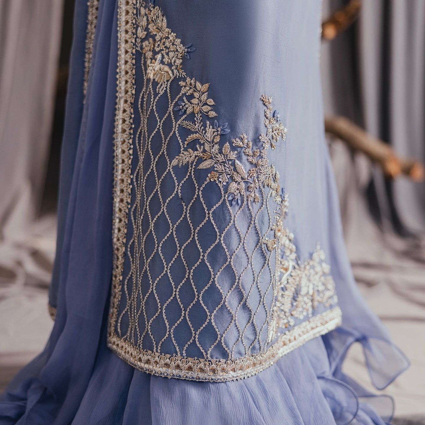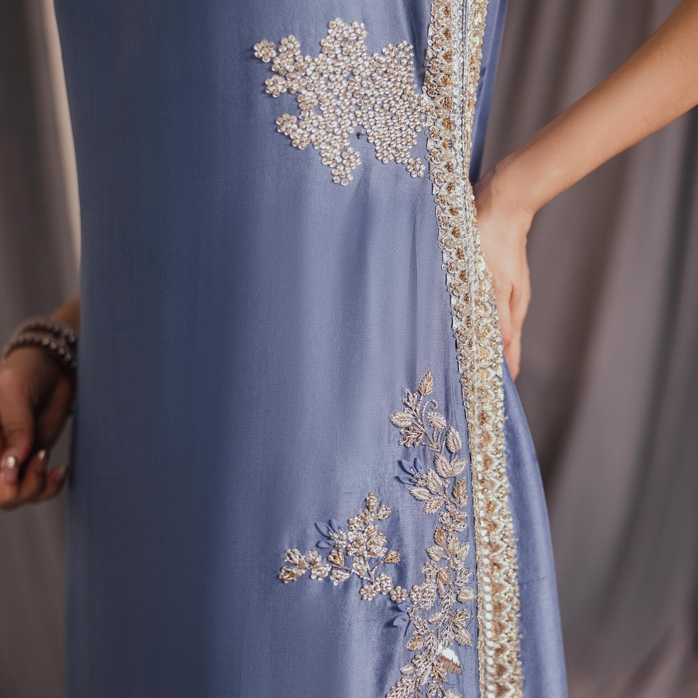 Lume blueβThis elegant long silhouette is cut from lamΓ© fabric in a soft lavender tone, featuring intricate ivory thread embroidery along the borders and hem. The neckline is accentuated with hand-embellished detailing, while the floral and lattice motifs at the base add refinement. Paired with layered organza for a graceful finish.