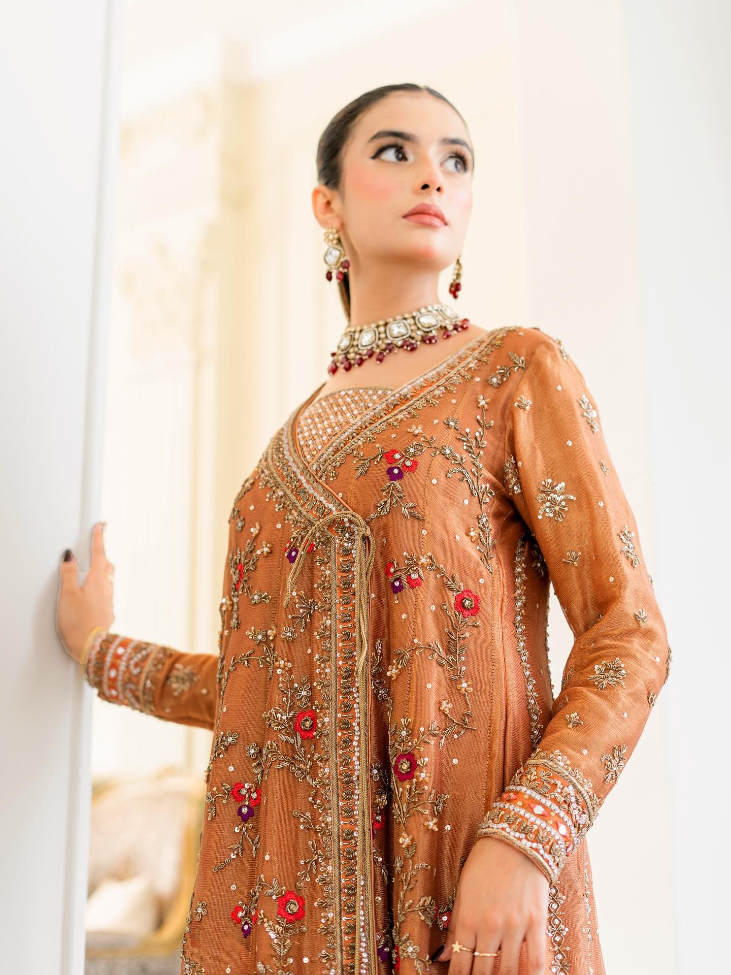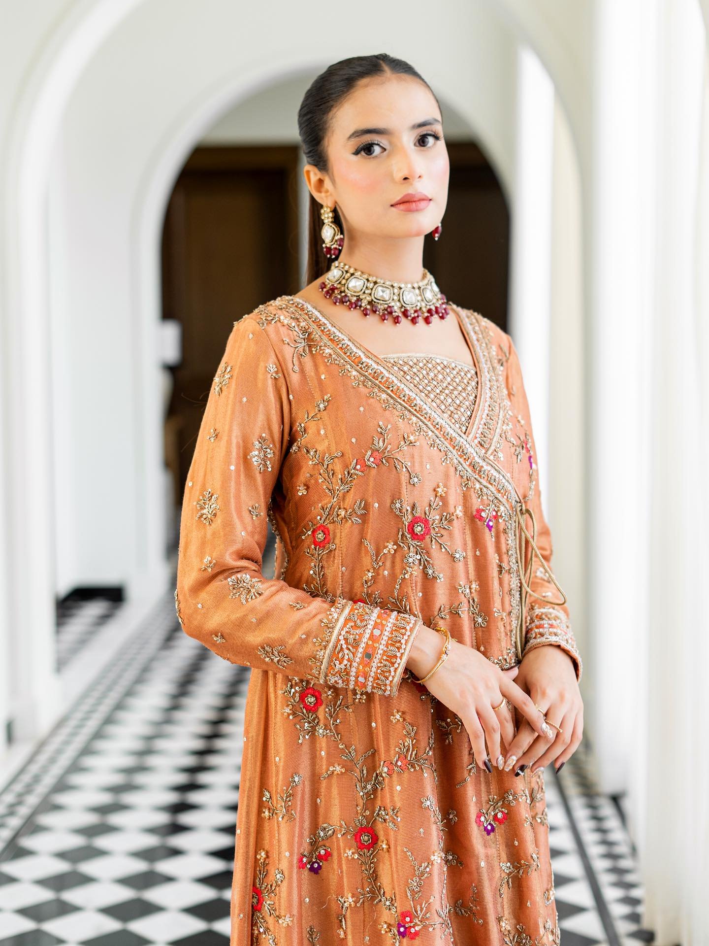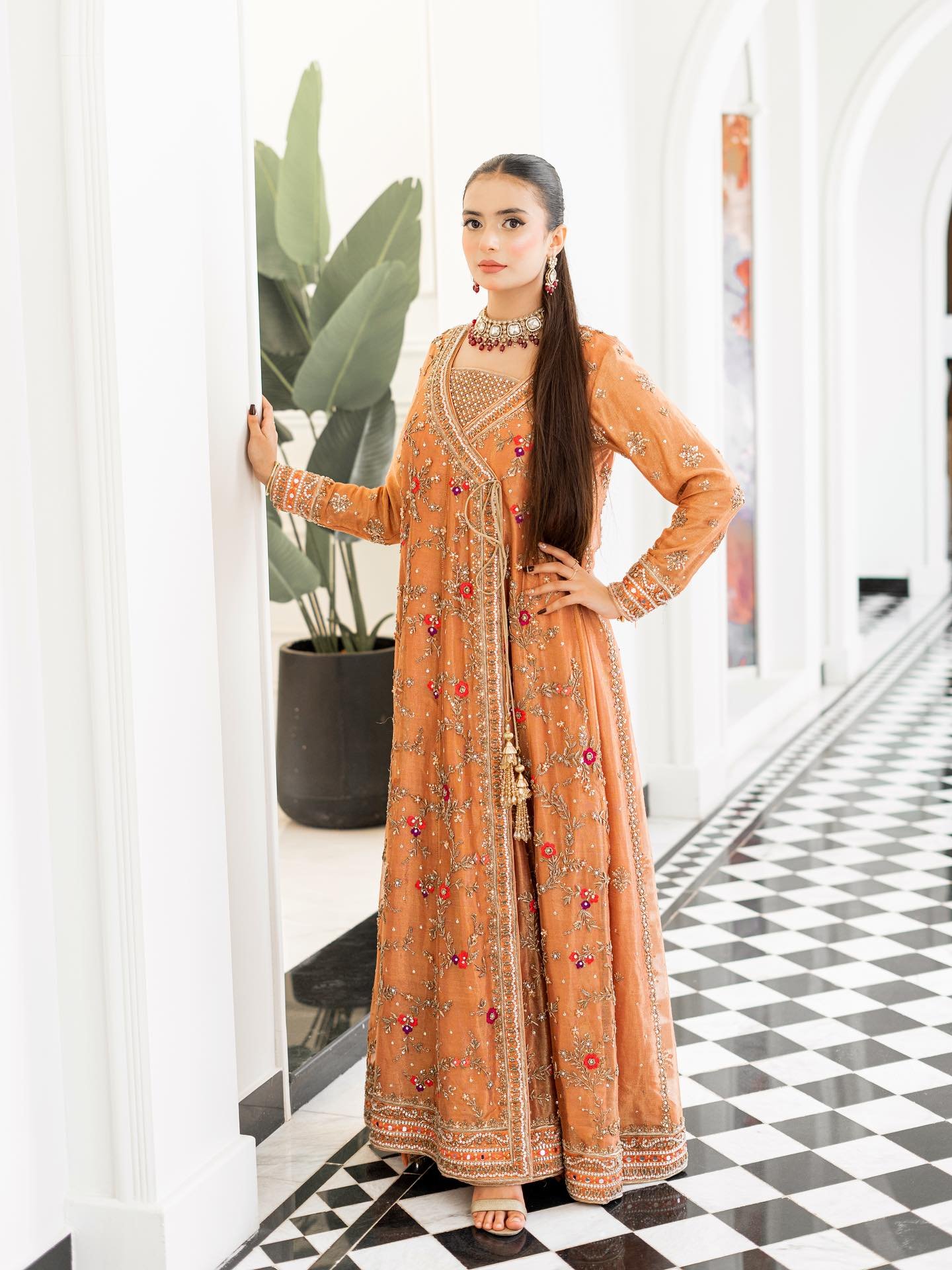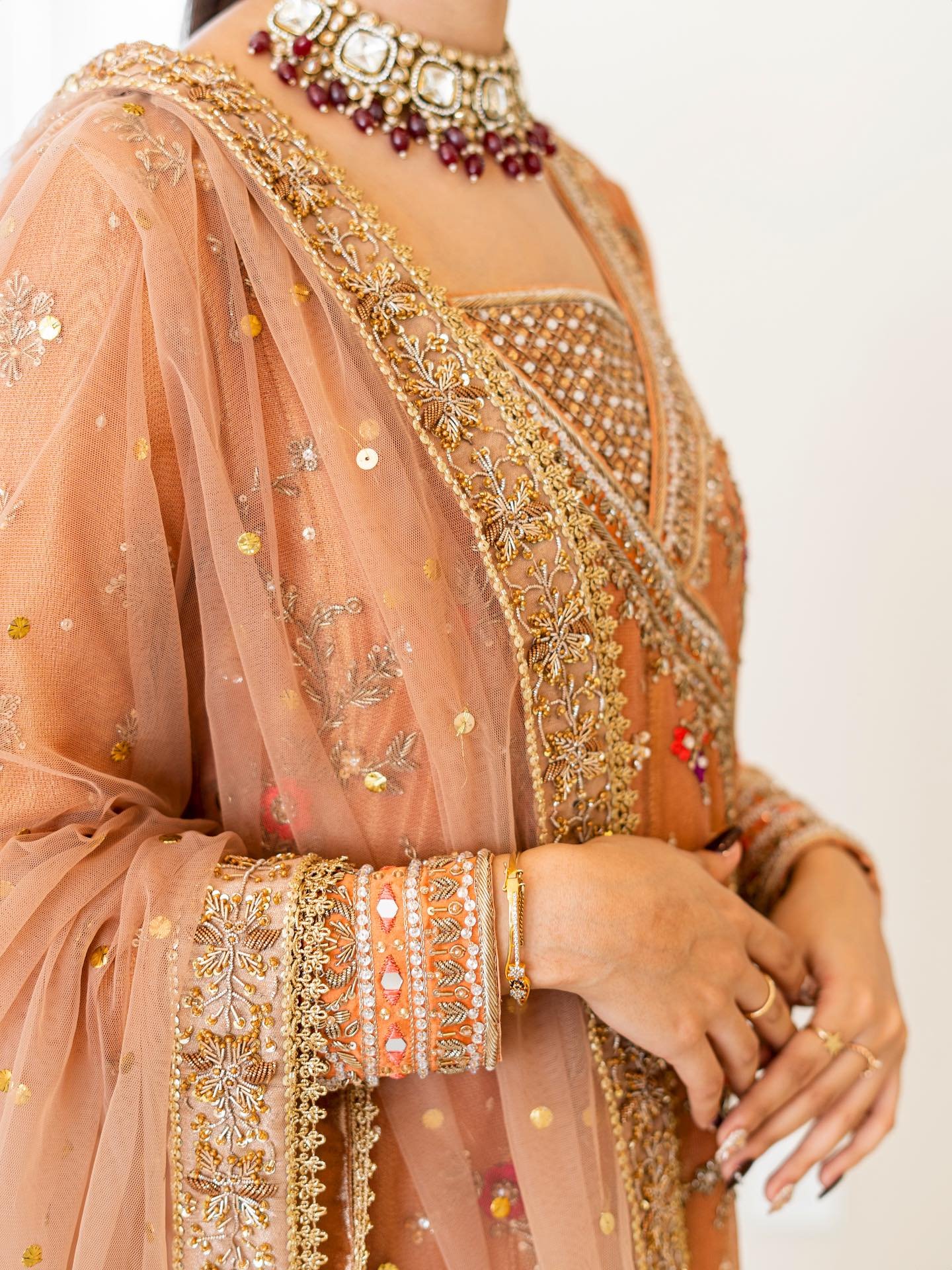 Step into elegance with our exquisite pastel orange Angrakha. This heavy, formal ensemble is crafted from pure cotton zari net fabric. The neckline, sleeves, and daman are adorned with detailed kora, dabka, resham,gota, crystals and mirror work. The look is completed with a handmade dupatta, embellished with heavy borders on all four sides, making it a perfect blend of traditional artistry and modern design.