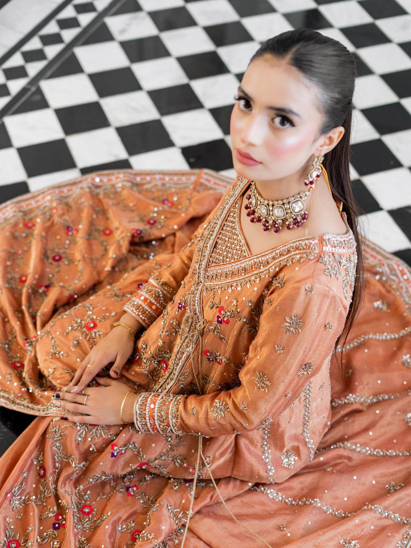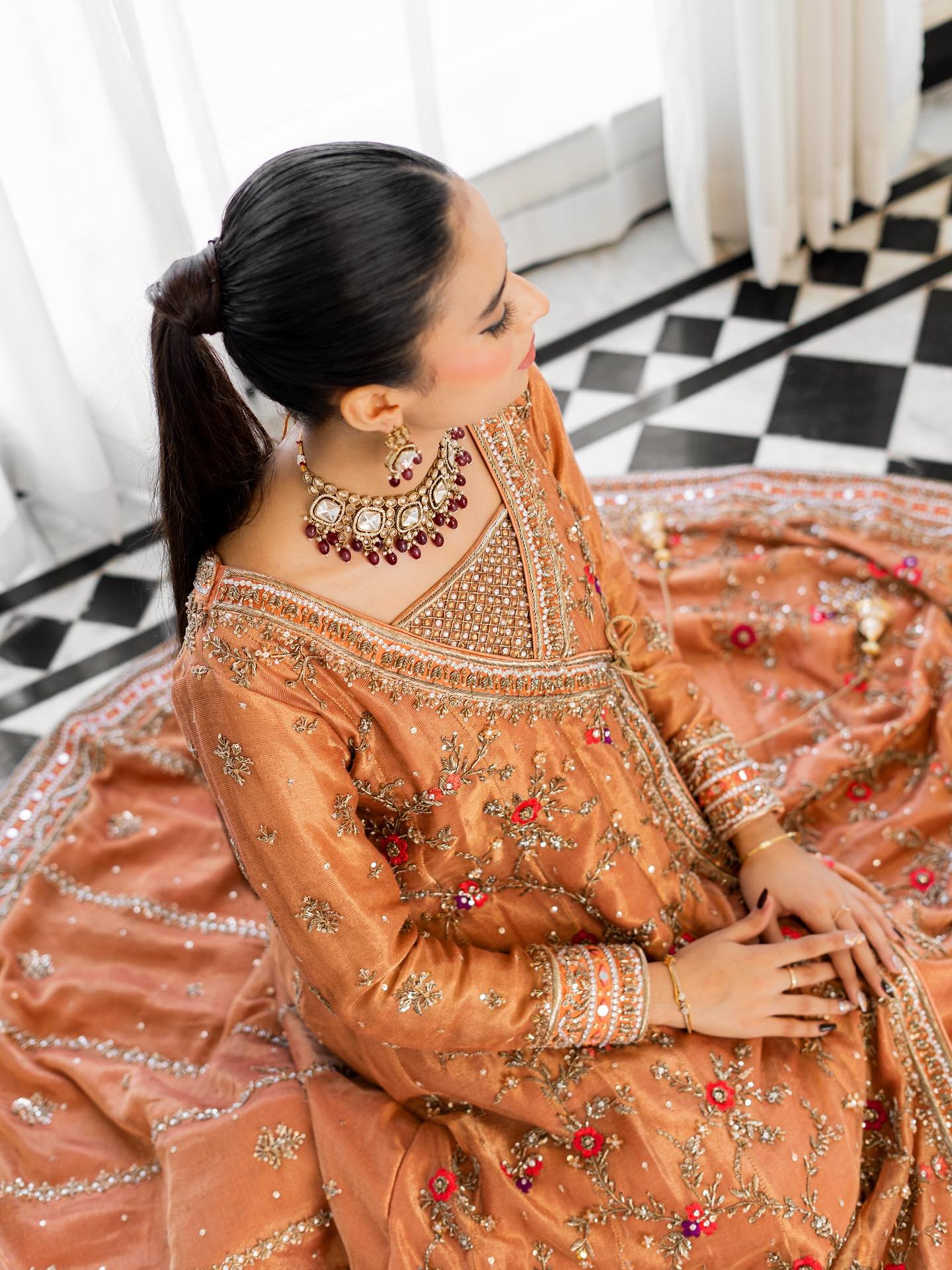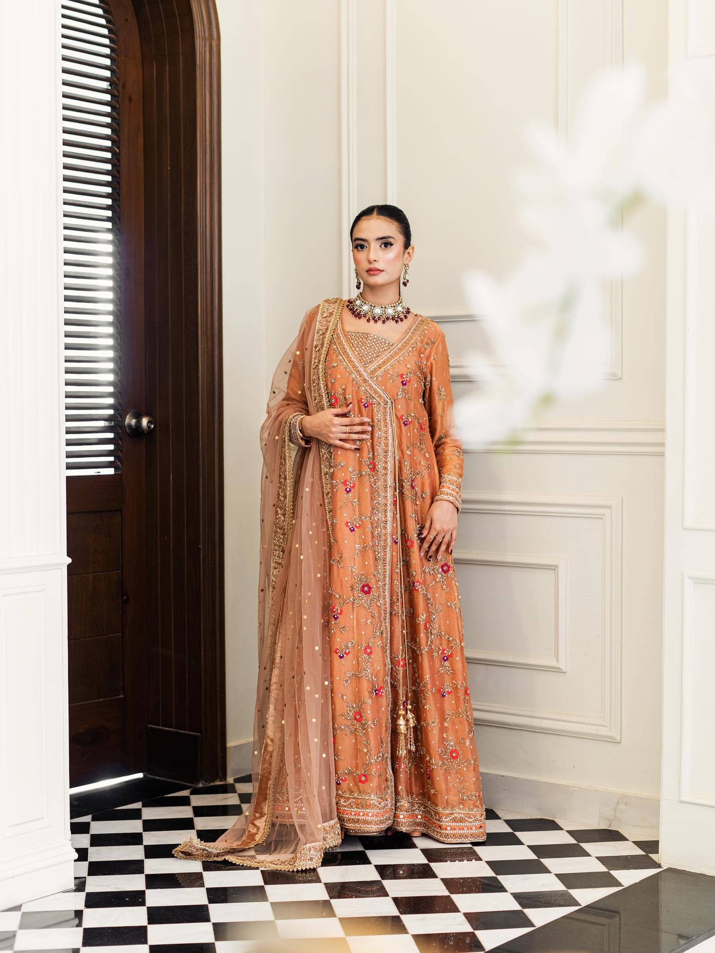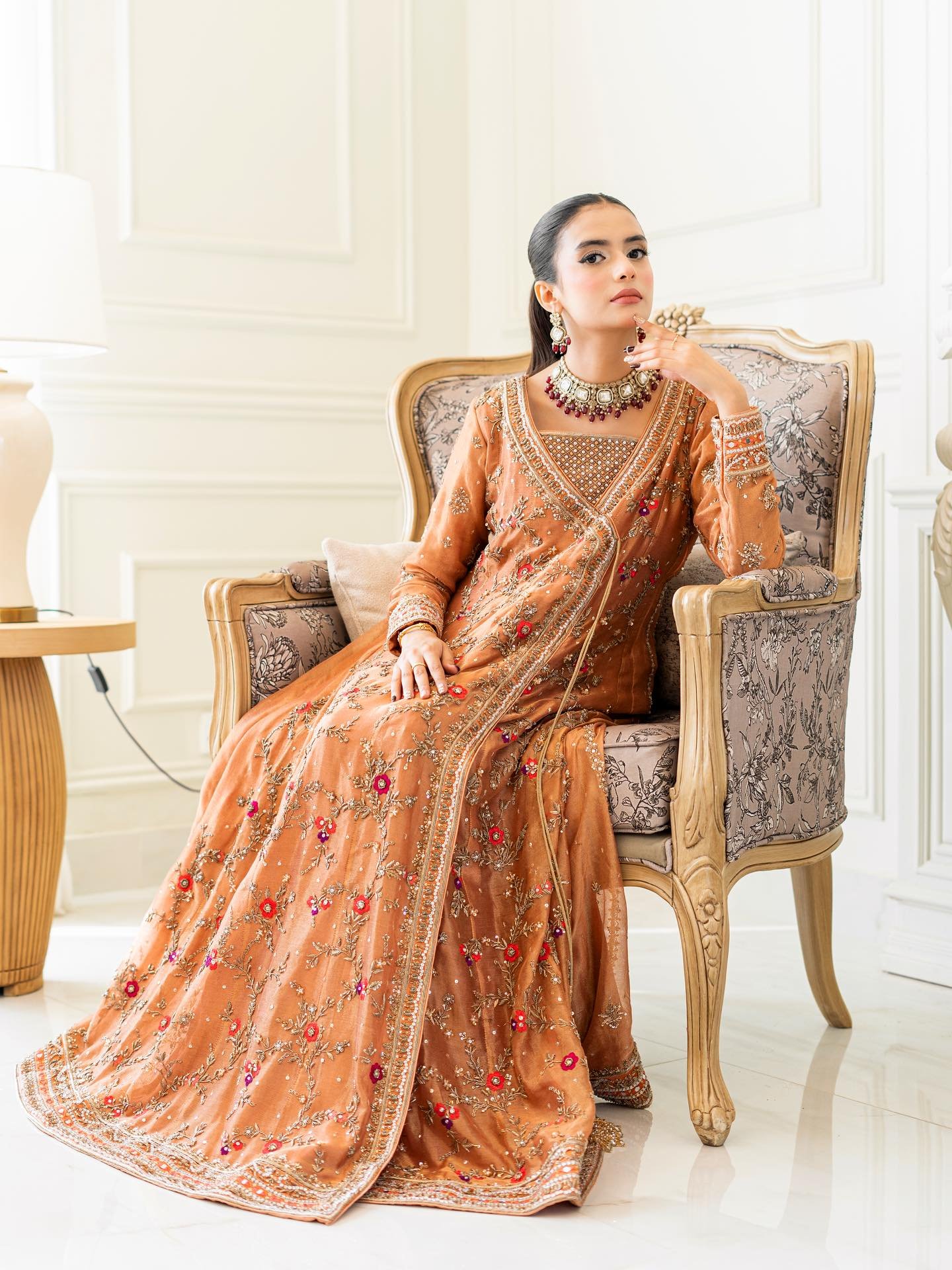 Step into elegance with our exquisite pastel orange Angrakha. This heavy, formal ensemble is crafted from pure cotton zari net fabric. The neckline, sleeves, and daman are adorned with detailed kora, dabka, resham,gota, crystals and mirror work. The look is completed with a handmade dupatta, embellished with heavy borders on all four sides, making it a perfect blend of traditional artistry and modern design.