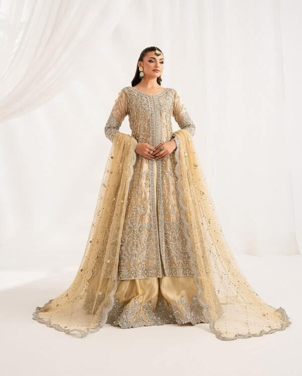 Heritage refined into silhouettes of quiet grandeur and exquisite handcraftmanship. This lama tissue silk gown is such an elegant embellished attire, radiating elegance and charm for the perfect wedding look. Paired up with tussel silk lehnga and net muqaish dupatta to complete the look