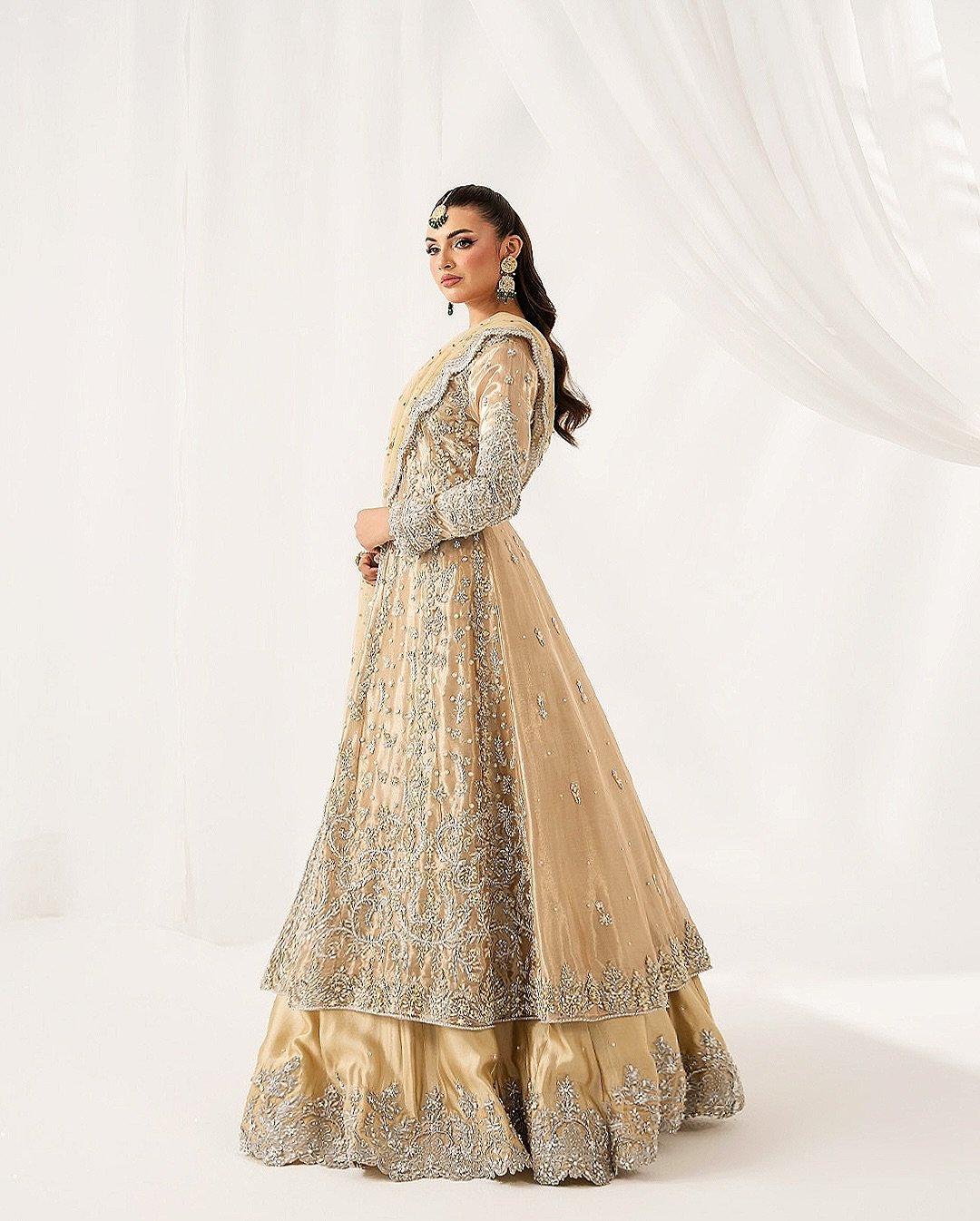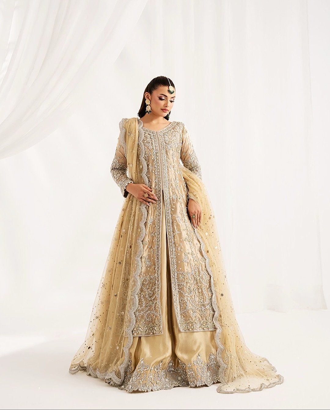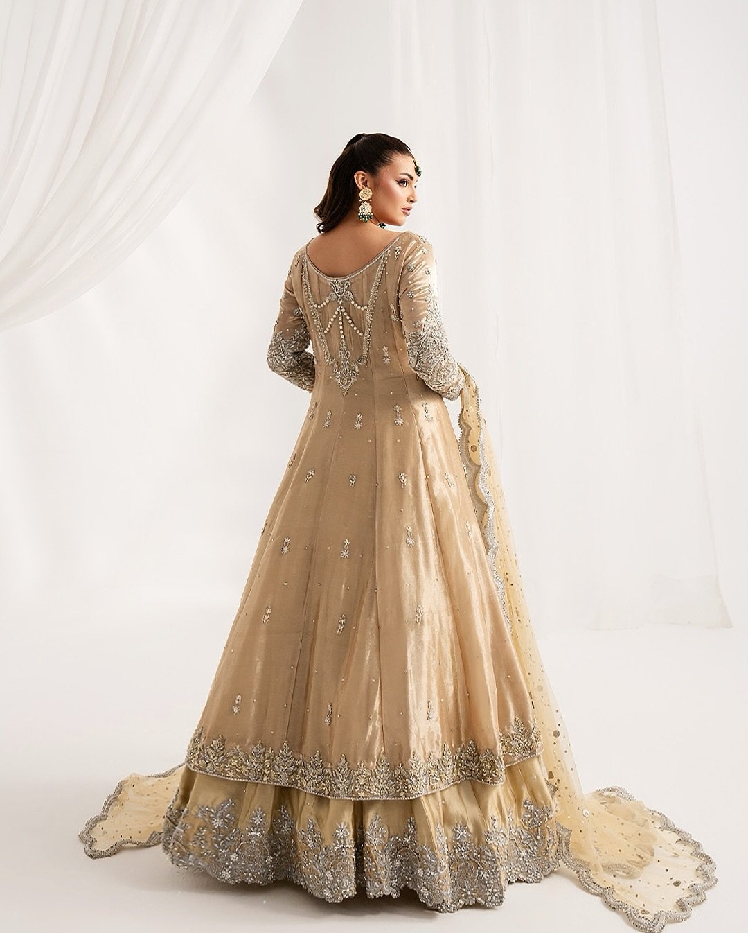 Heritage refined into silhouettes of quiet grandeur and exquisite handcraftmanship. This lama tissue silk gown is such an elegant embellished attire, radiating elegance and charm for the perfect wedding look. Paired up with tussel silk lehnga and net muqaish dupatta to complete the look