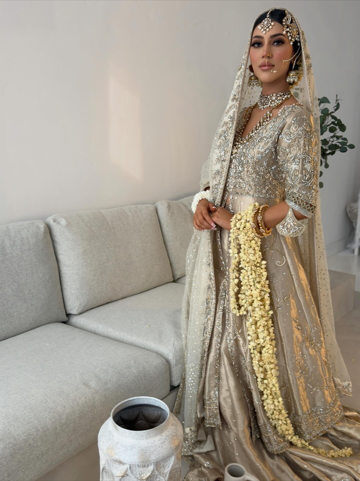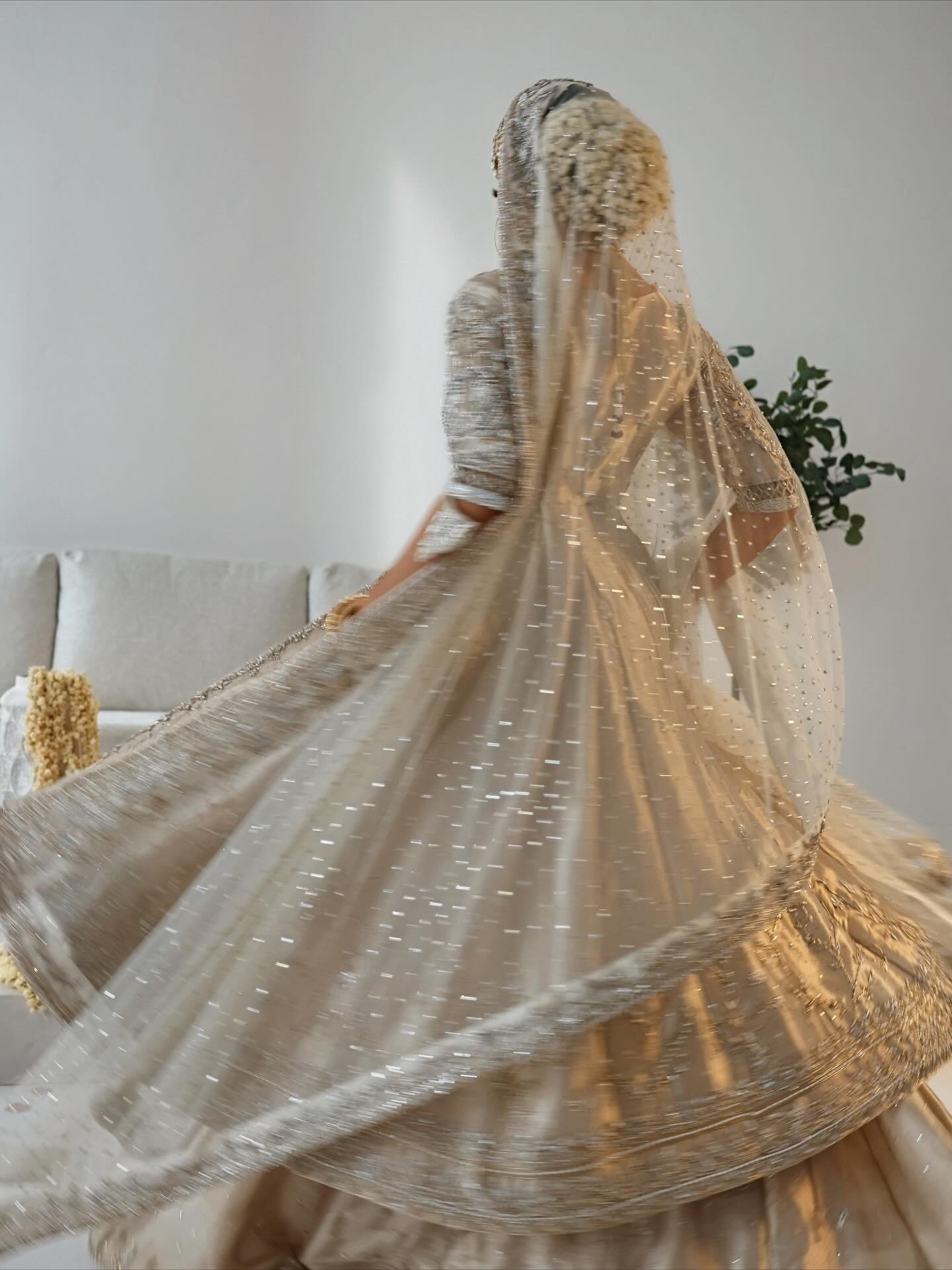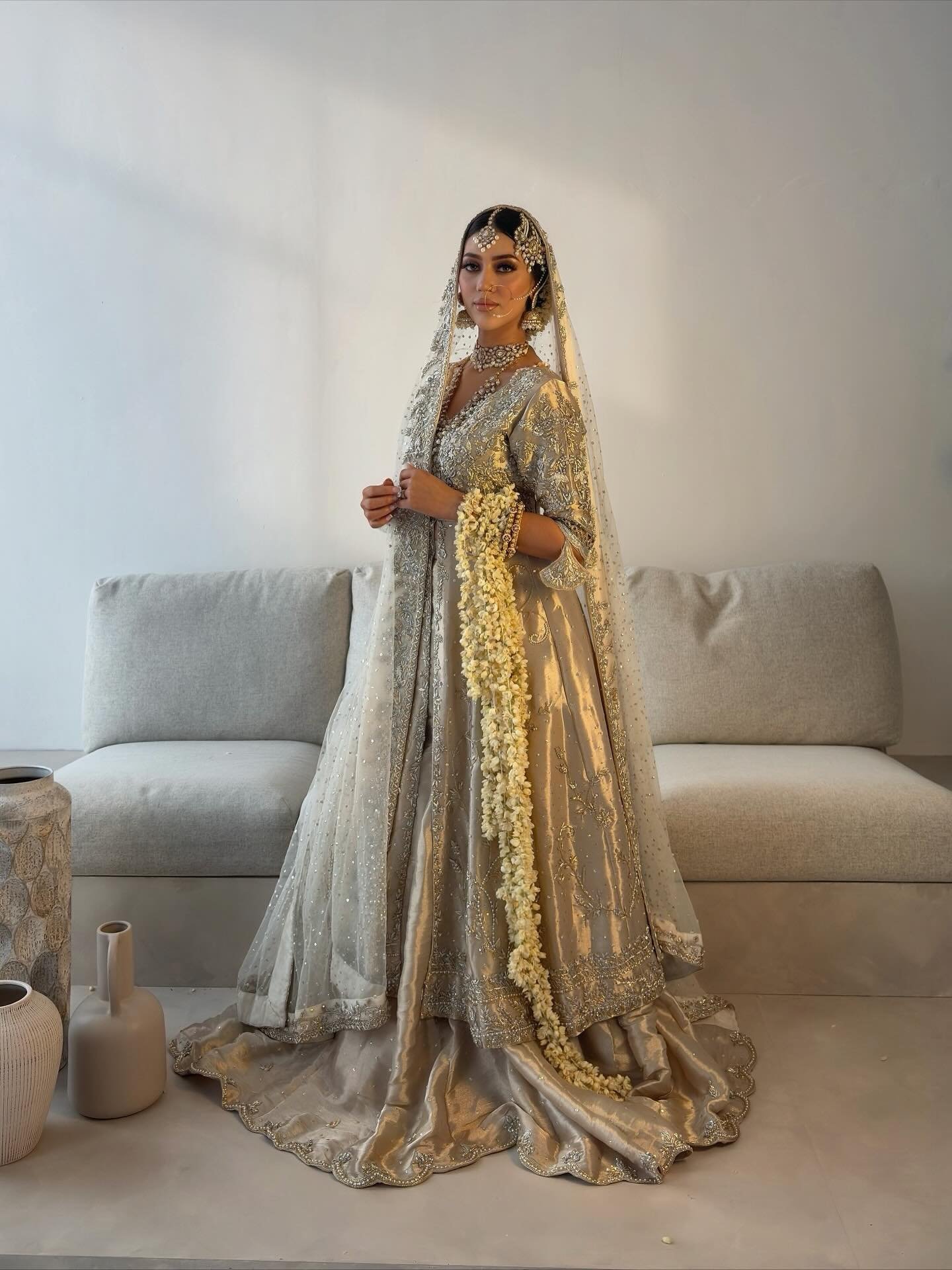 This breathtaking bridal outfit showcases an exquisite fusion of traditional craftsmanship and contemporary elegance. The ensemble features a luxurious muted gold–champagne hue with intricate silver and pearl embellishments, creating a soft, celestial glow that complements the bride’s radiance.