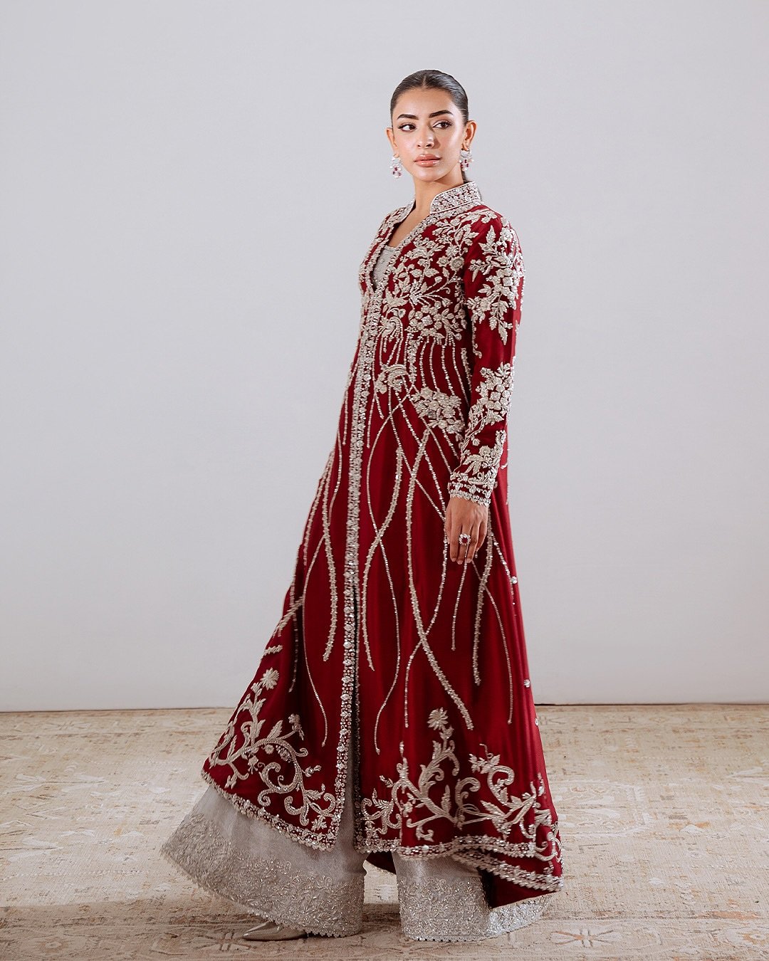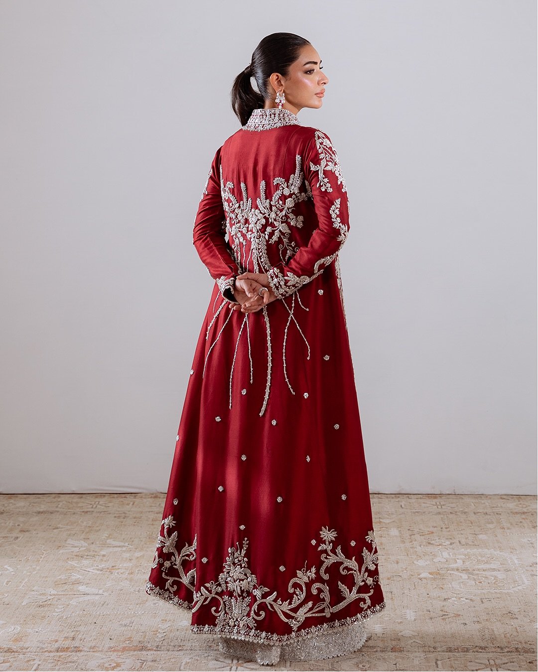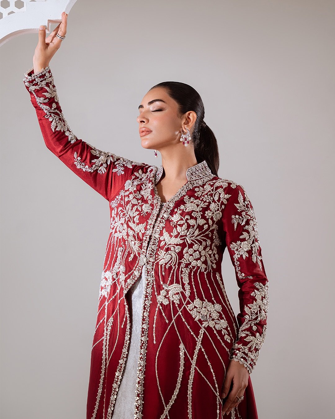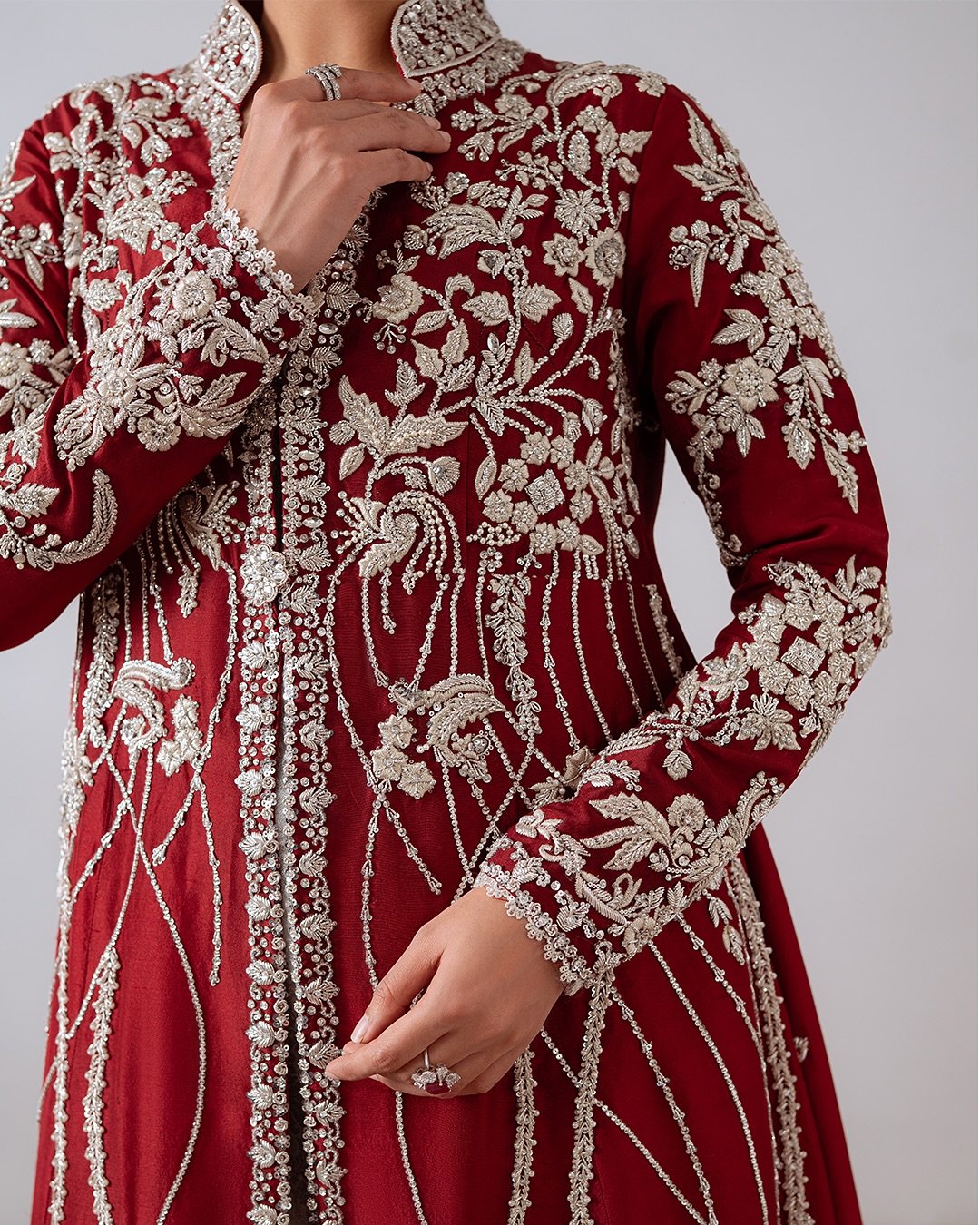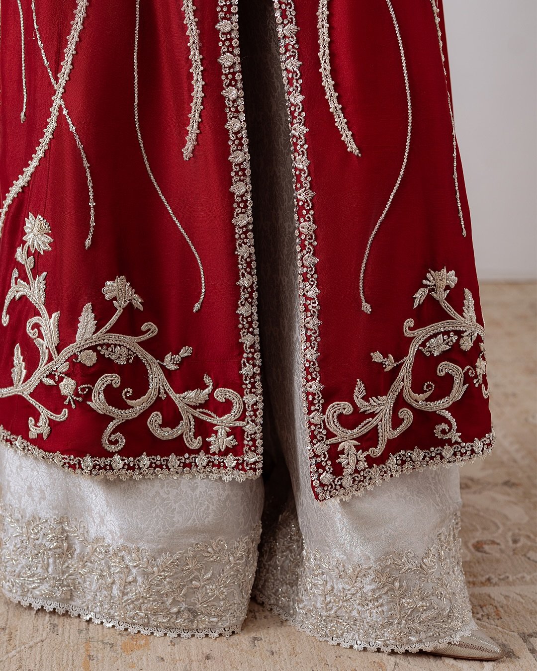 Imperial Rouge – A statement raw silk jacket with intricate handwork, layered over a delicately worked bodice shirt, paired with pure jamawar palazzo pants highlighted with fine hand embellishments.