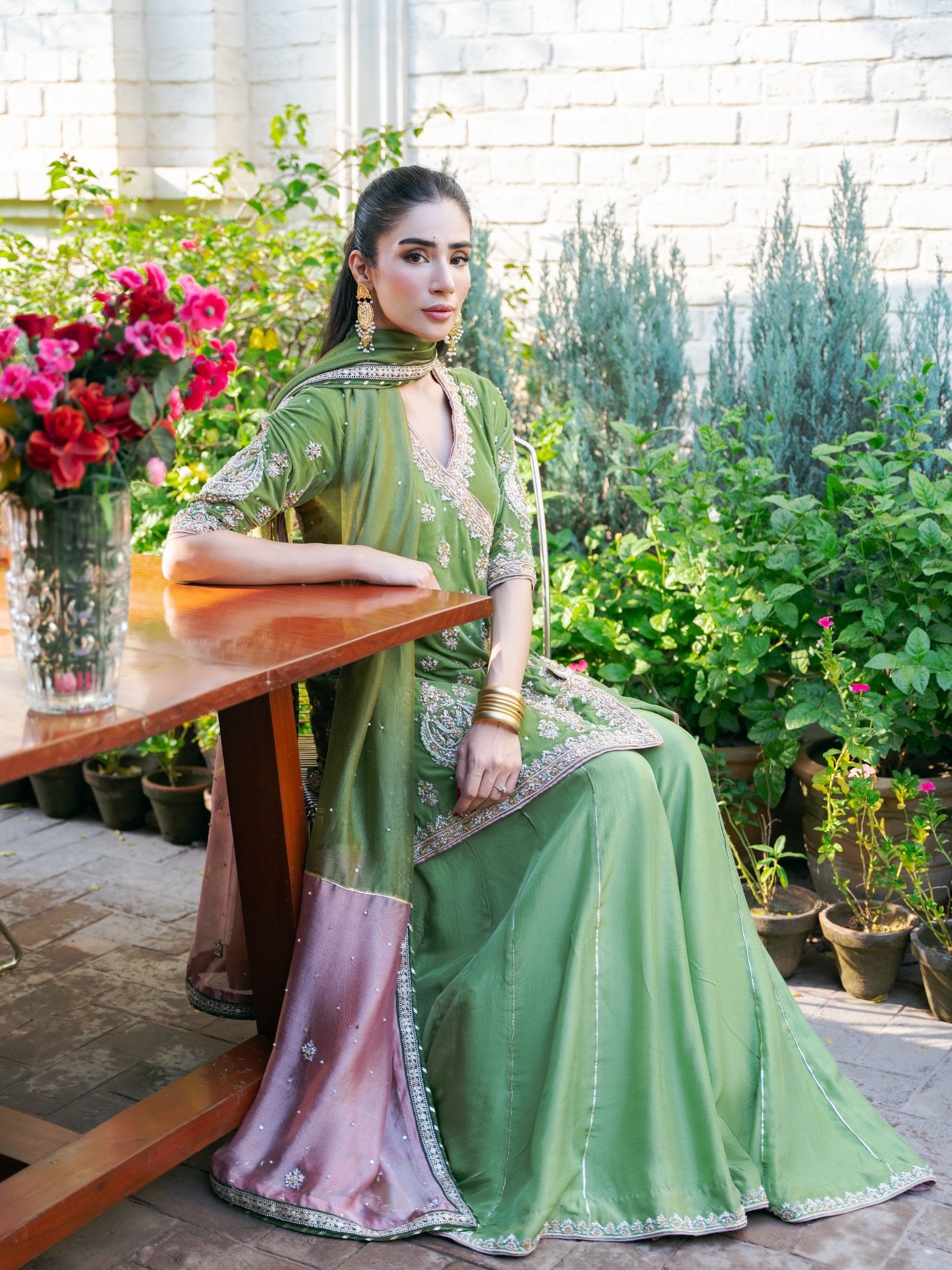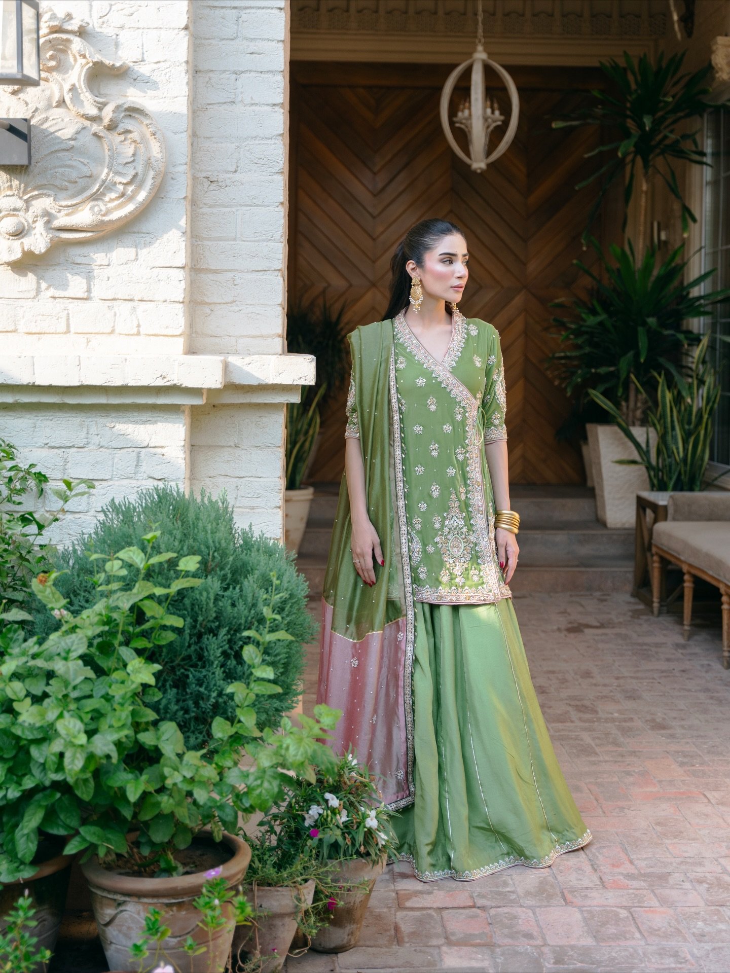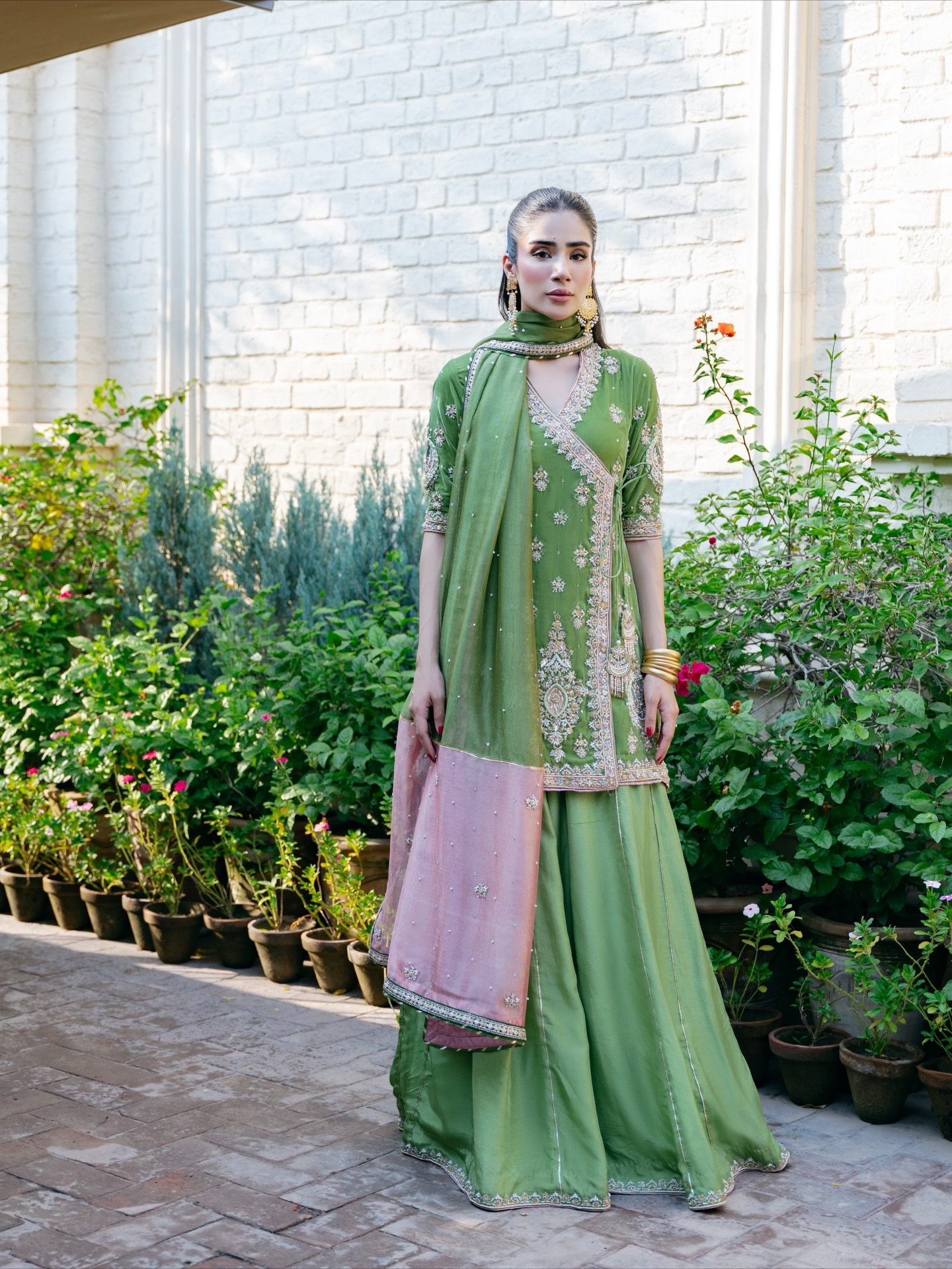The attire is a stunning example of South Asian formal wear, likely a contemporary take on a traditional Gharara/Sharara ensemble.