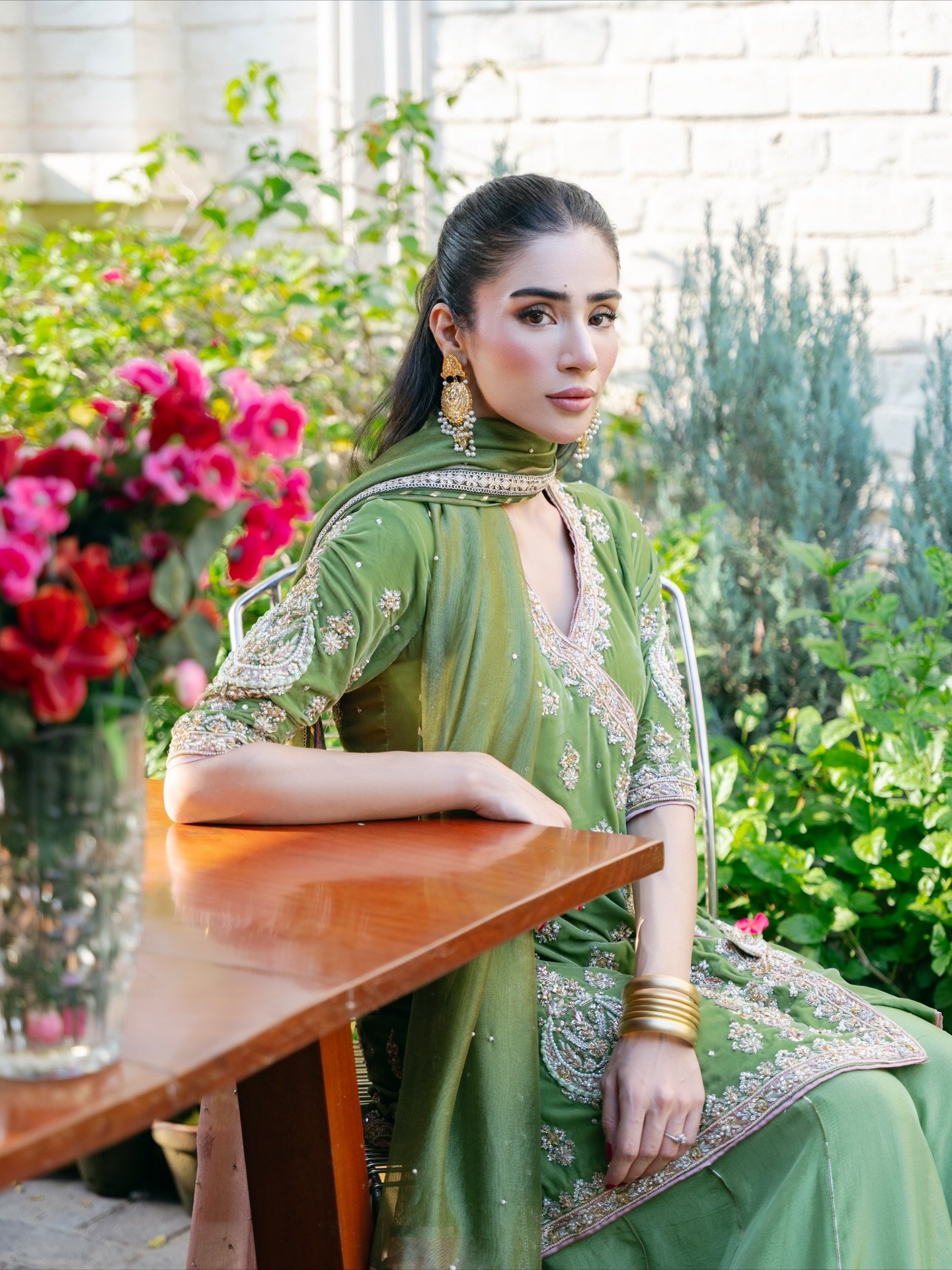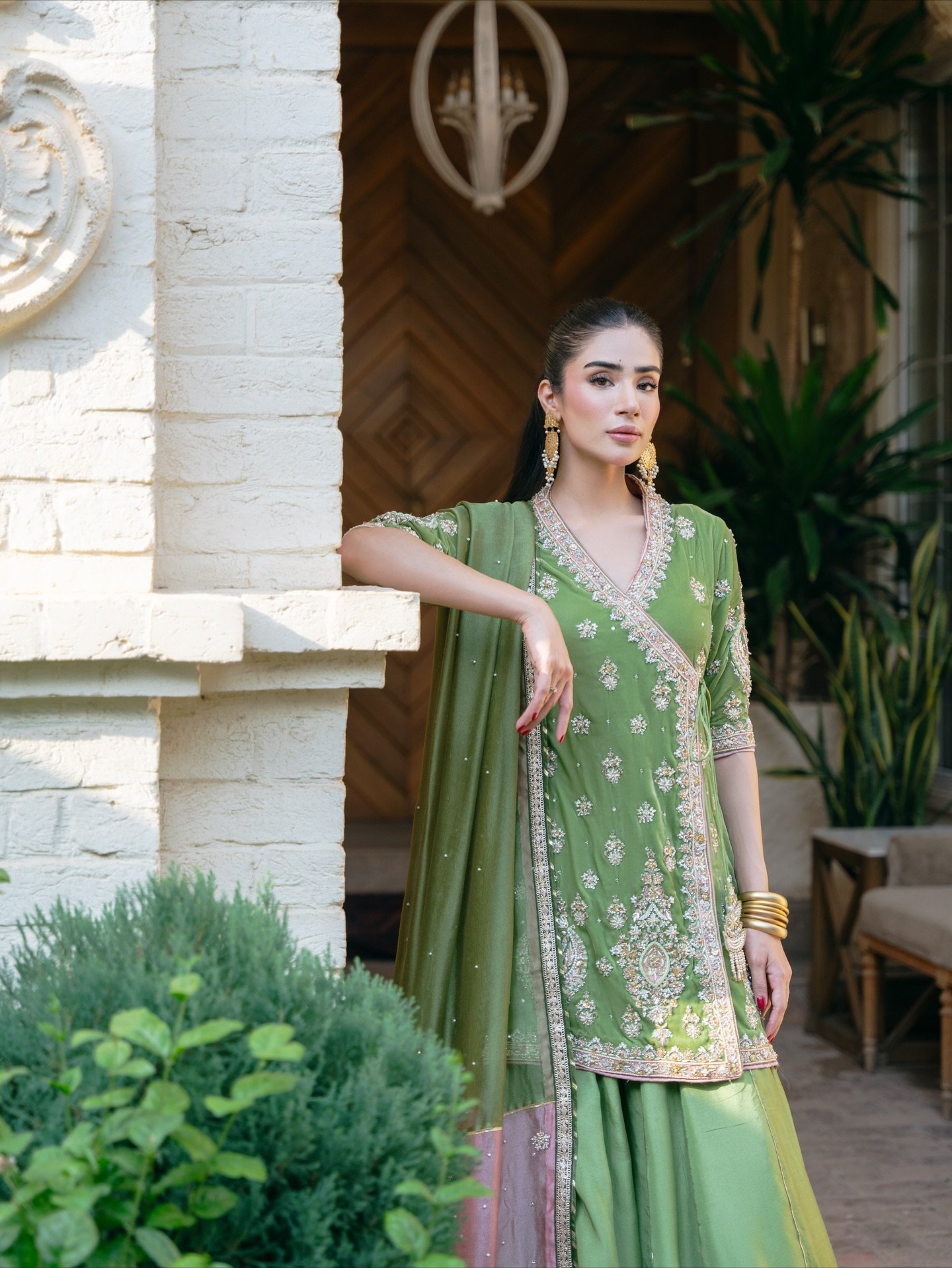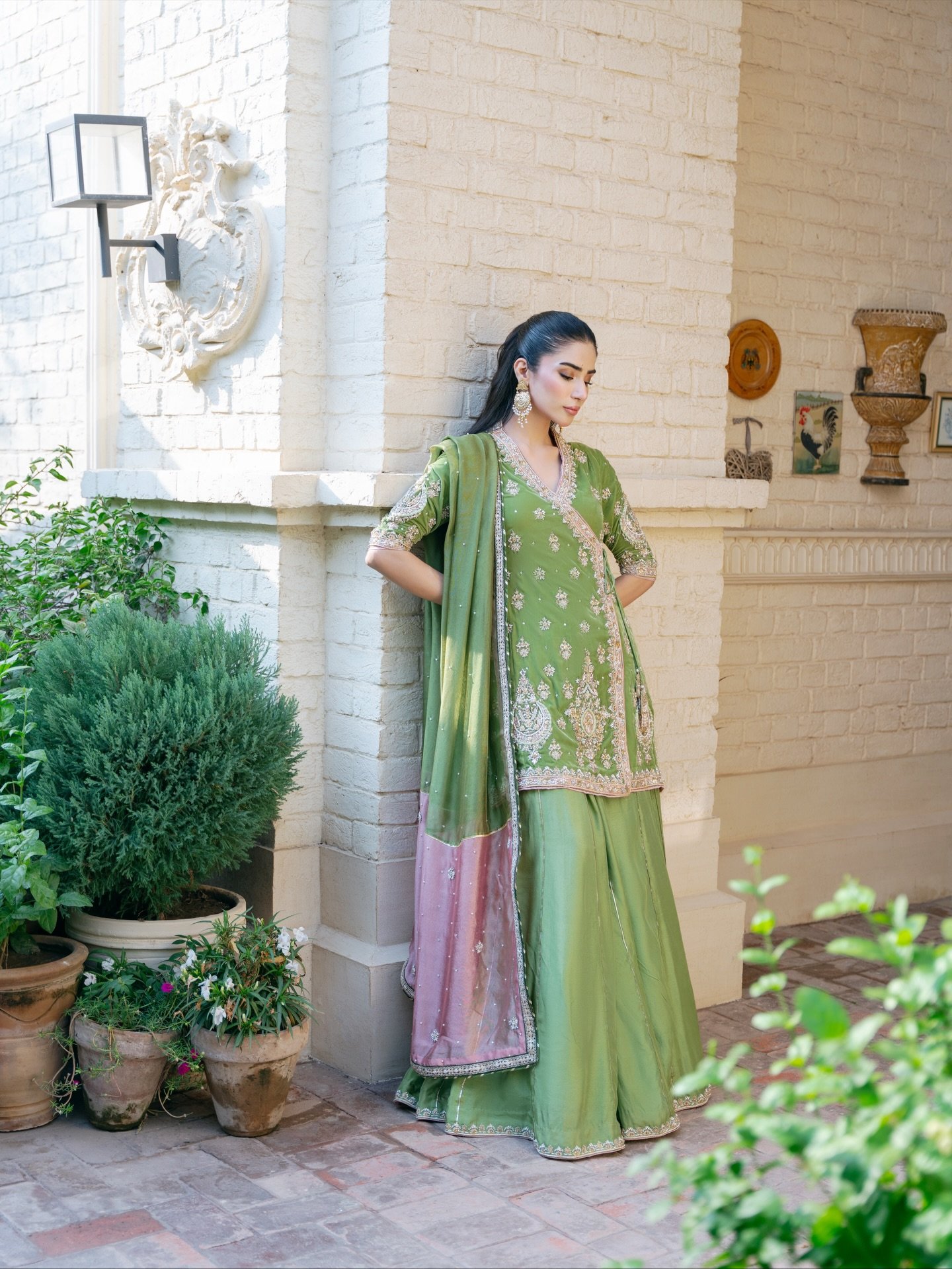The attire is a stunning example of South Asian formal wear, likely a contemporary take on a traditional Gharara/Sharara ensemble.