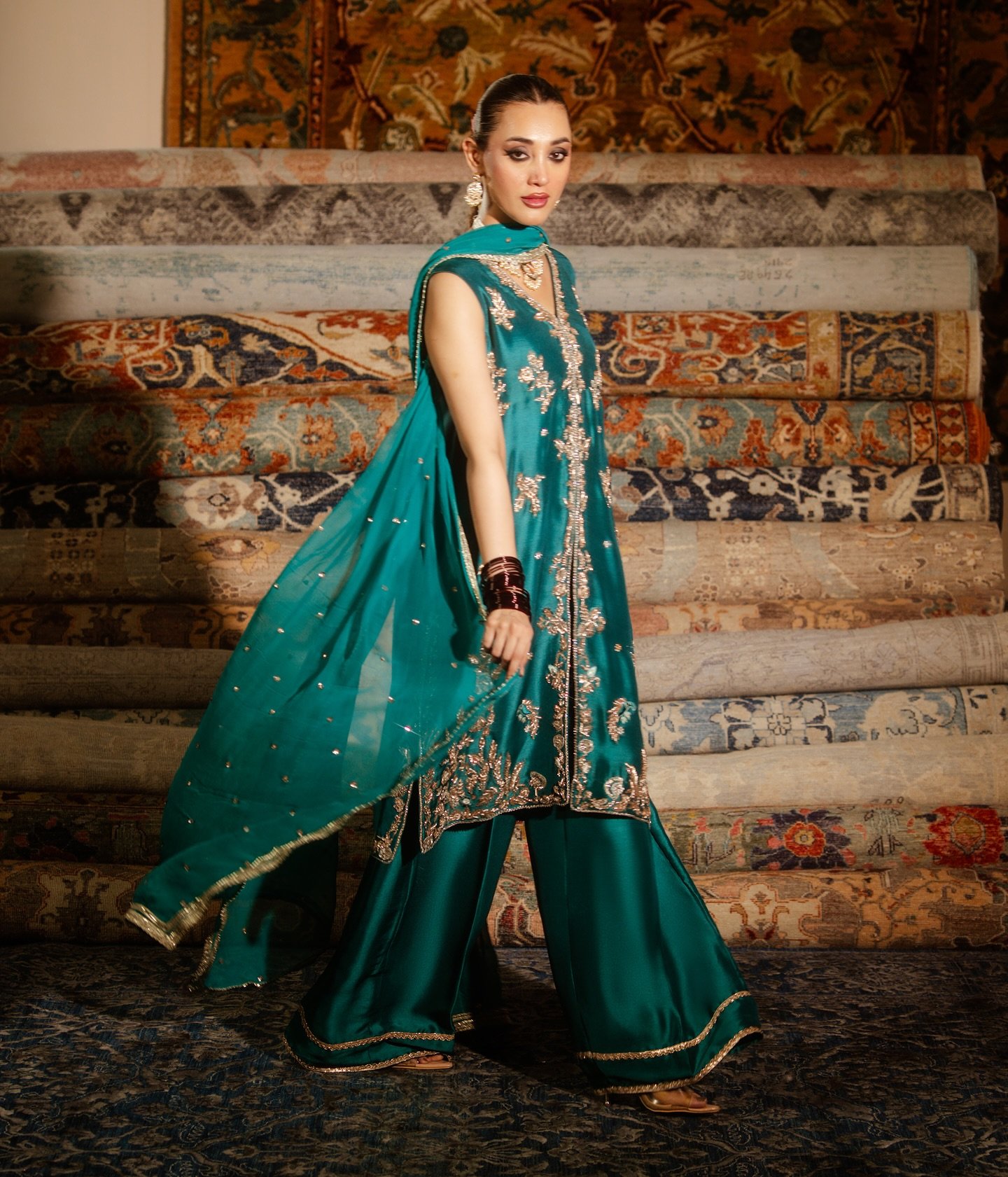 Trousers: Wide-leg silk or raw silk shalwar or gharara pants (palazzo-style), usually with a subtle matching embroidered border at the cuff.