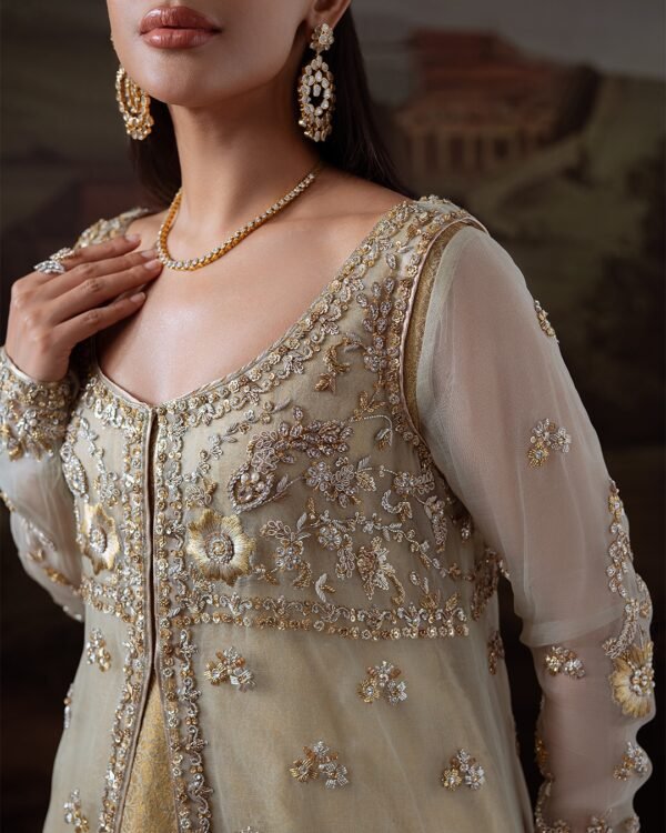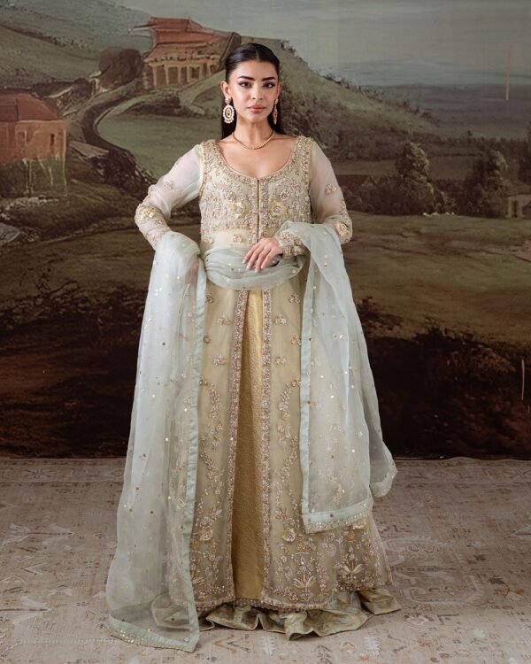 Minted Luxe – A pure organza peshwas-cut shirt, fully handworked to perfection, layered over a jamawar undershirt and lehenga. Paired with an intricately handworked organza dupatta, completing the look with regal finesse.
