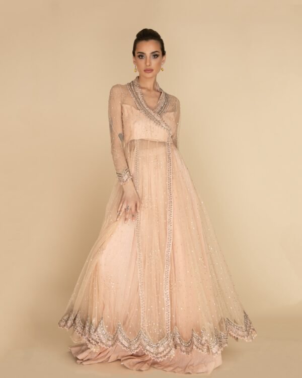 Elegance meets extravagance in a pure gold lama fabric front-open shirt adorned with meticulous zardozi, threadwork, and stones on the shirt and sleeves. Handmade pearl tassels add a touch of opulence to the sleeves, complemented by red jamawar finishing.