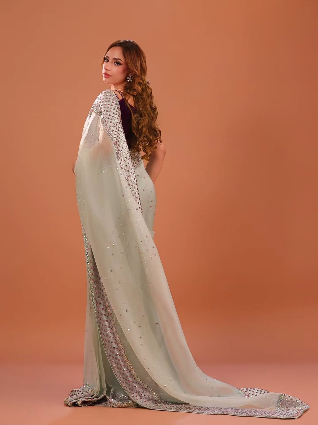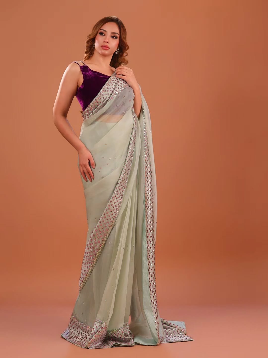 The Saree: A soft pistachio or seafoam green drape made from a lightweight, sheer fabric (likely chiffon or georgette). It features a delicate scattering of sequins across the body and a scalloped border heavily embellished with silver and pink stonework.