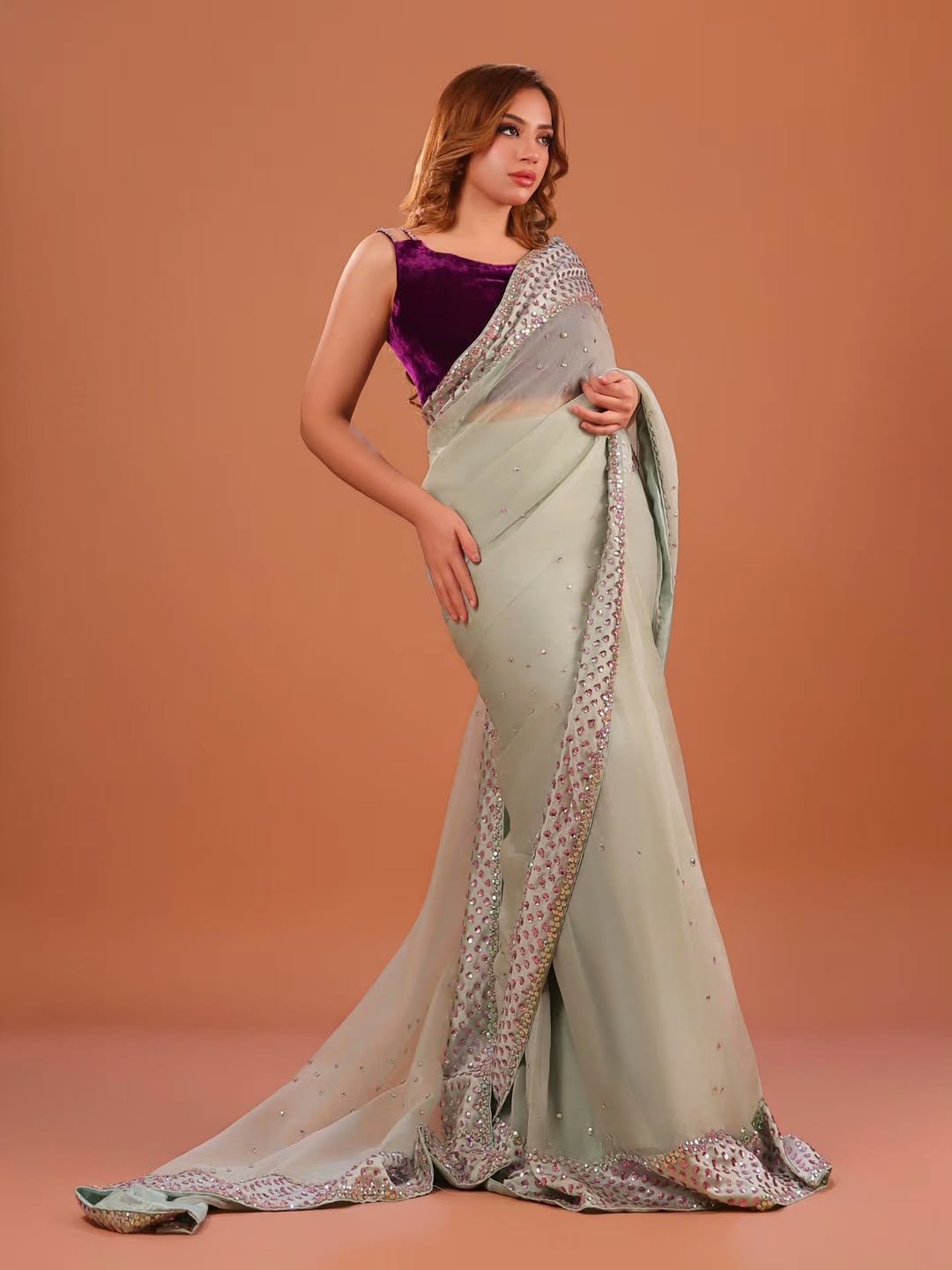 The Blouse: A sleeveless, cropped bodice in a deep plum or royal purple velvet. The matte, plush texture of the velvet provides a striking visual anchor against the shimmer of the saree.