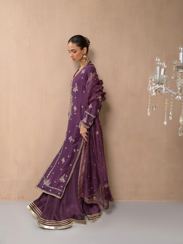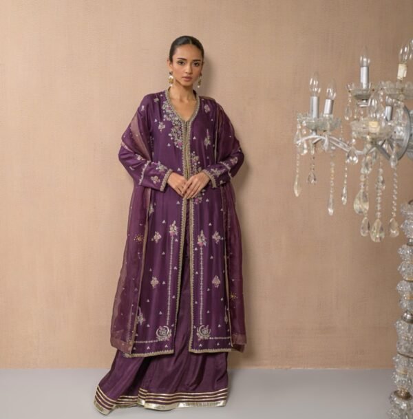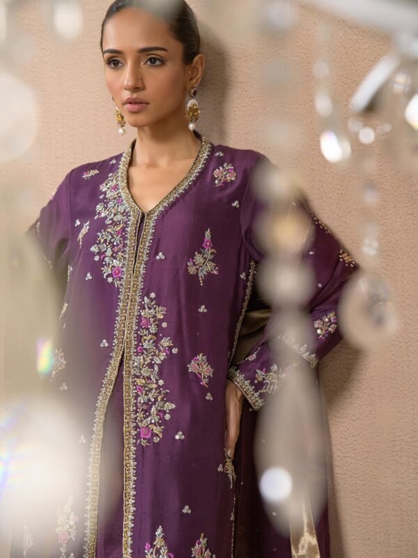 Introducing a festive look that glows from every angle — purplish silk, hand-finished zardozi, and glints of crystal, part of our newest edit.