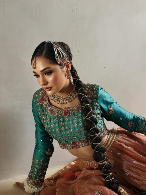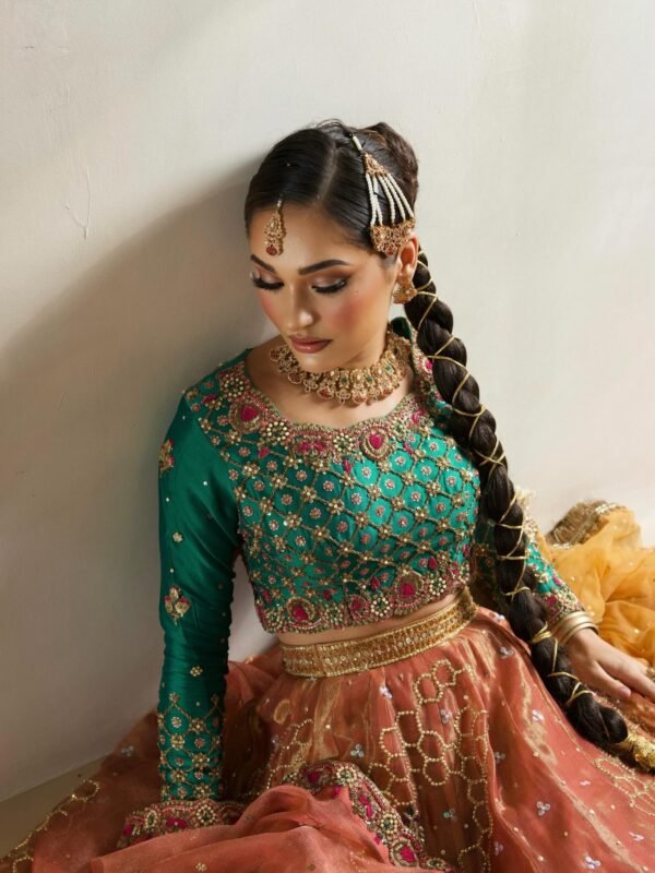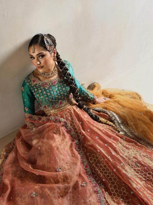 • Color Palette: A striking contrast of Teal Green (Firozi/Zammurud) and Burnt Copper/Rust (Tamra). The warm, metallic orange tones of the lehenga balance the coolness of the emerald-toned bodice.