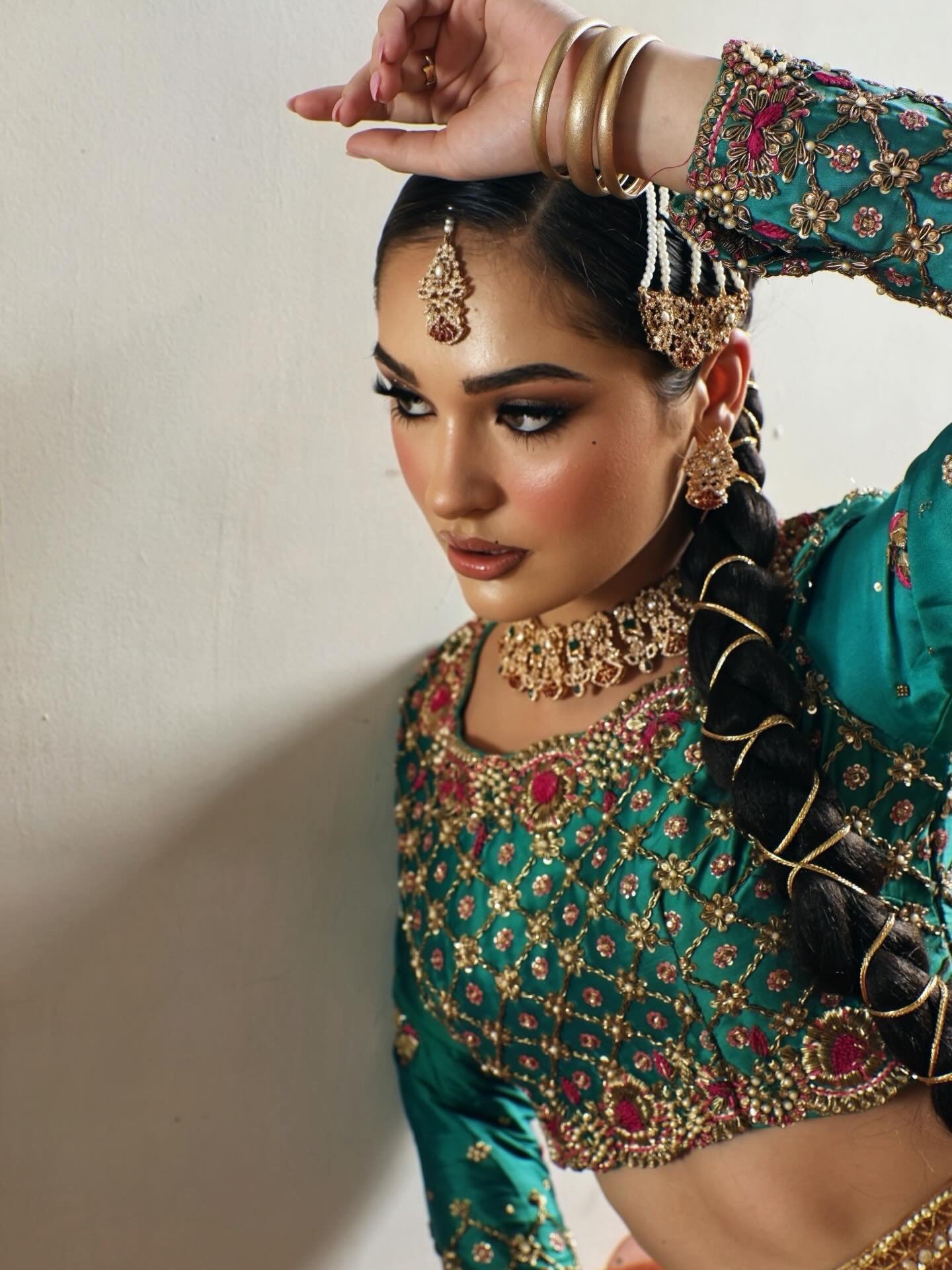 • Styling & Accessories: * The Braid: A classic long plait (paranda-style) adorned with gold thread.