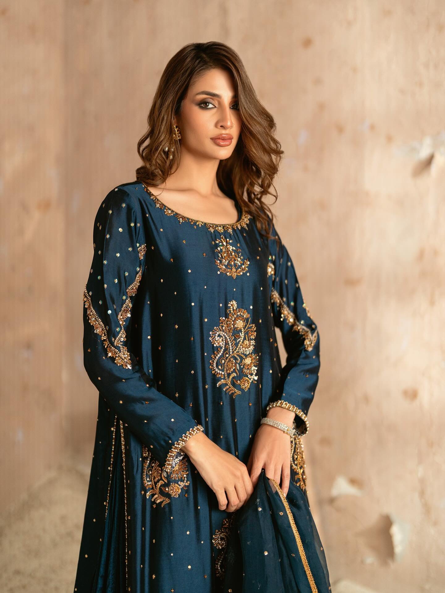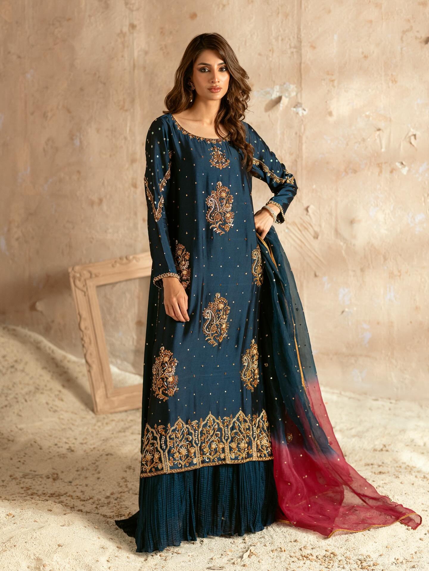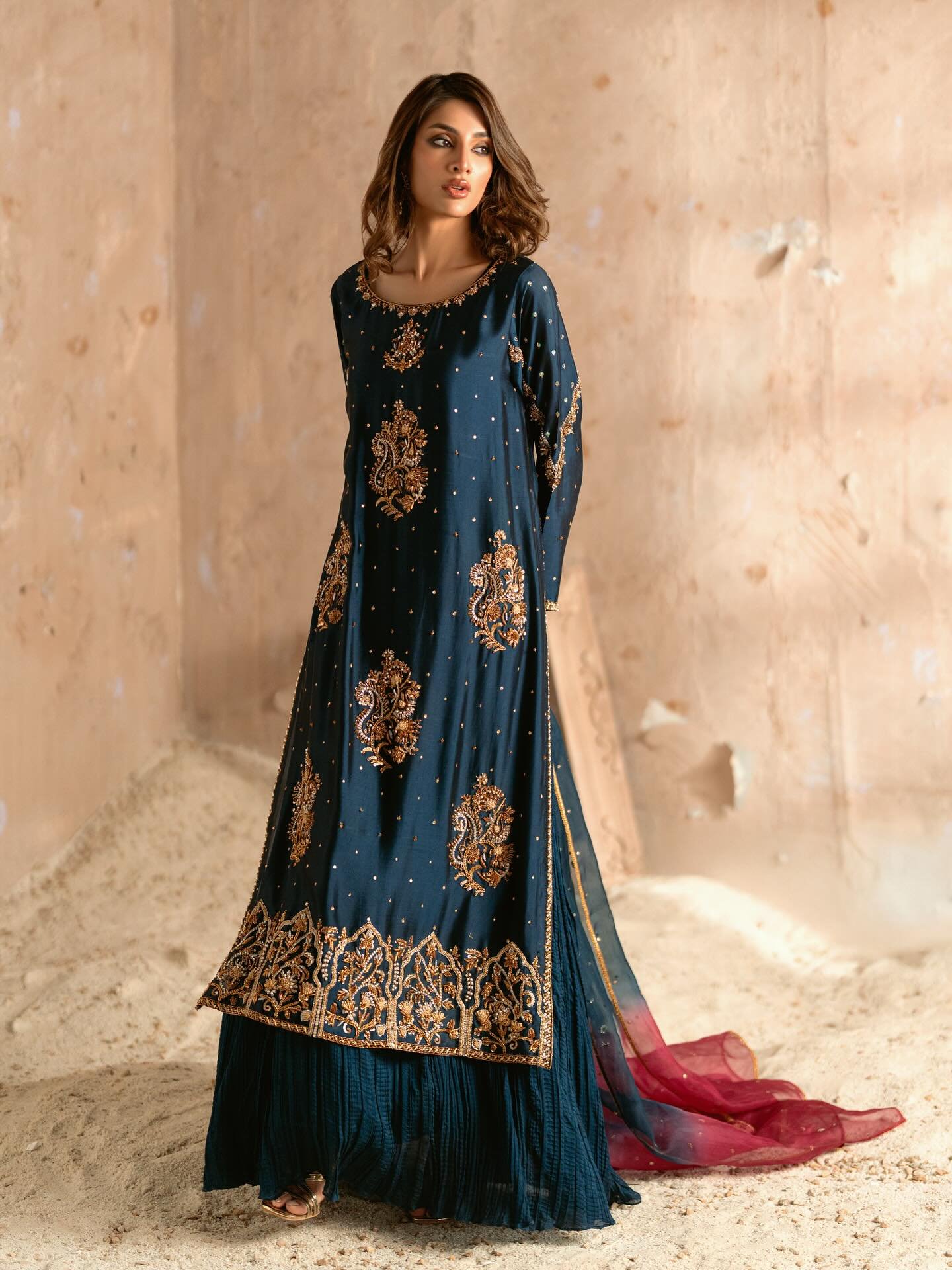 Lower: The shirt is paired with a floor-length Crushed Silk or Chiffon sharara/skirt in a matching deep teal, providing a voluminous and regal texture.