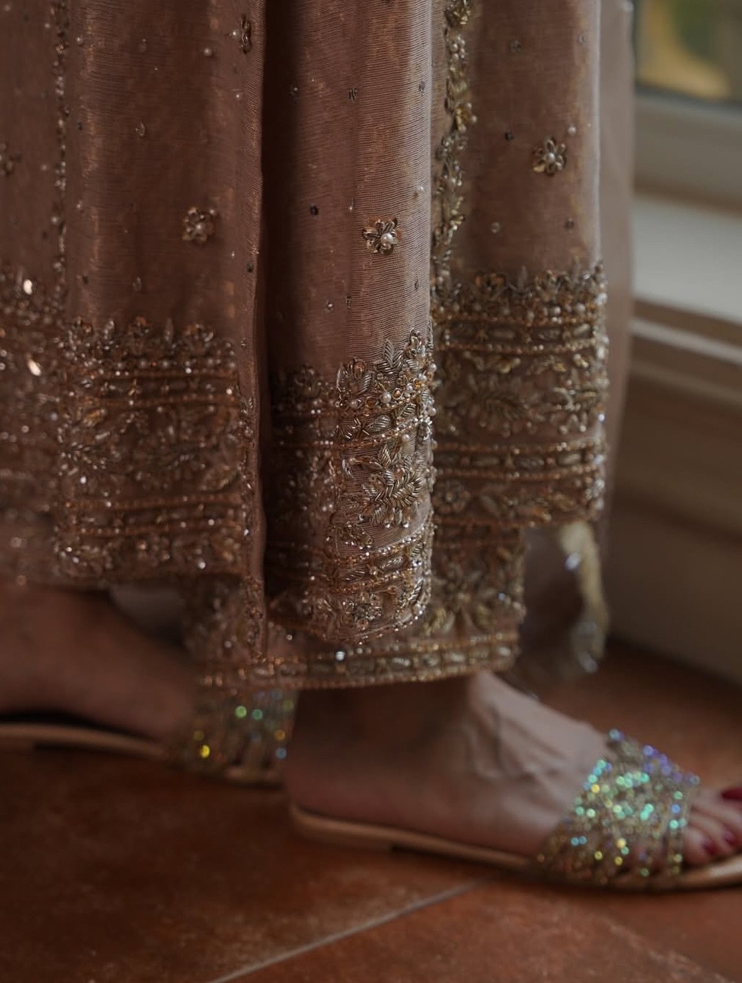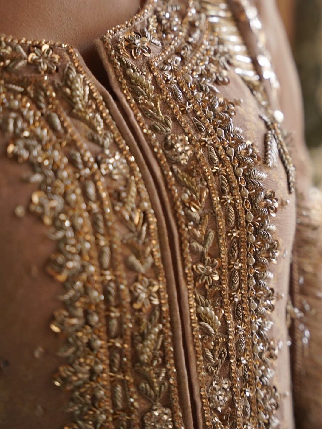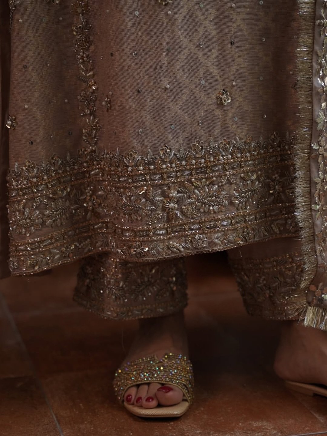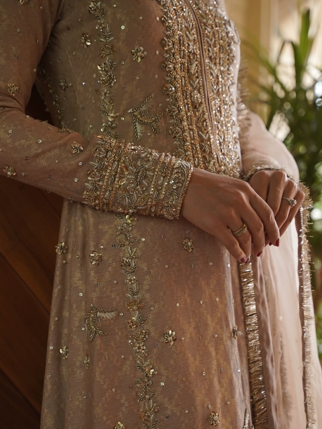 A captivating shade of beige with a lovely subtle gold zari sheen is completely hand embellished with zardozi, sequins, Swarovski stones . The hand-worked neckline with an A-line shirt elevates your festive look. Comes with a thick border on trouser. And fully embellished mukesh dupatta with four sided Kiran lace.