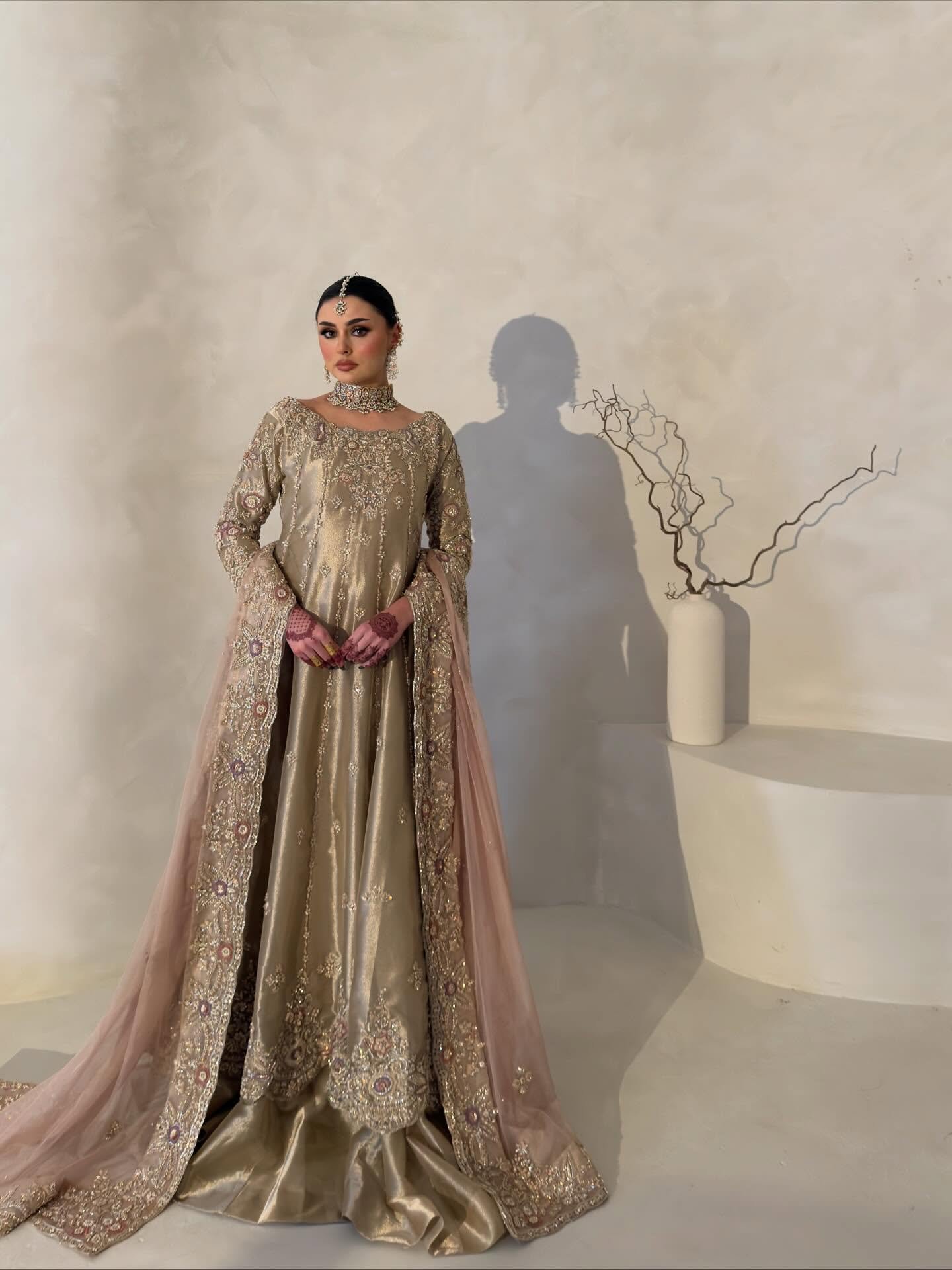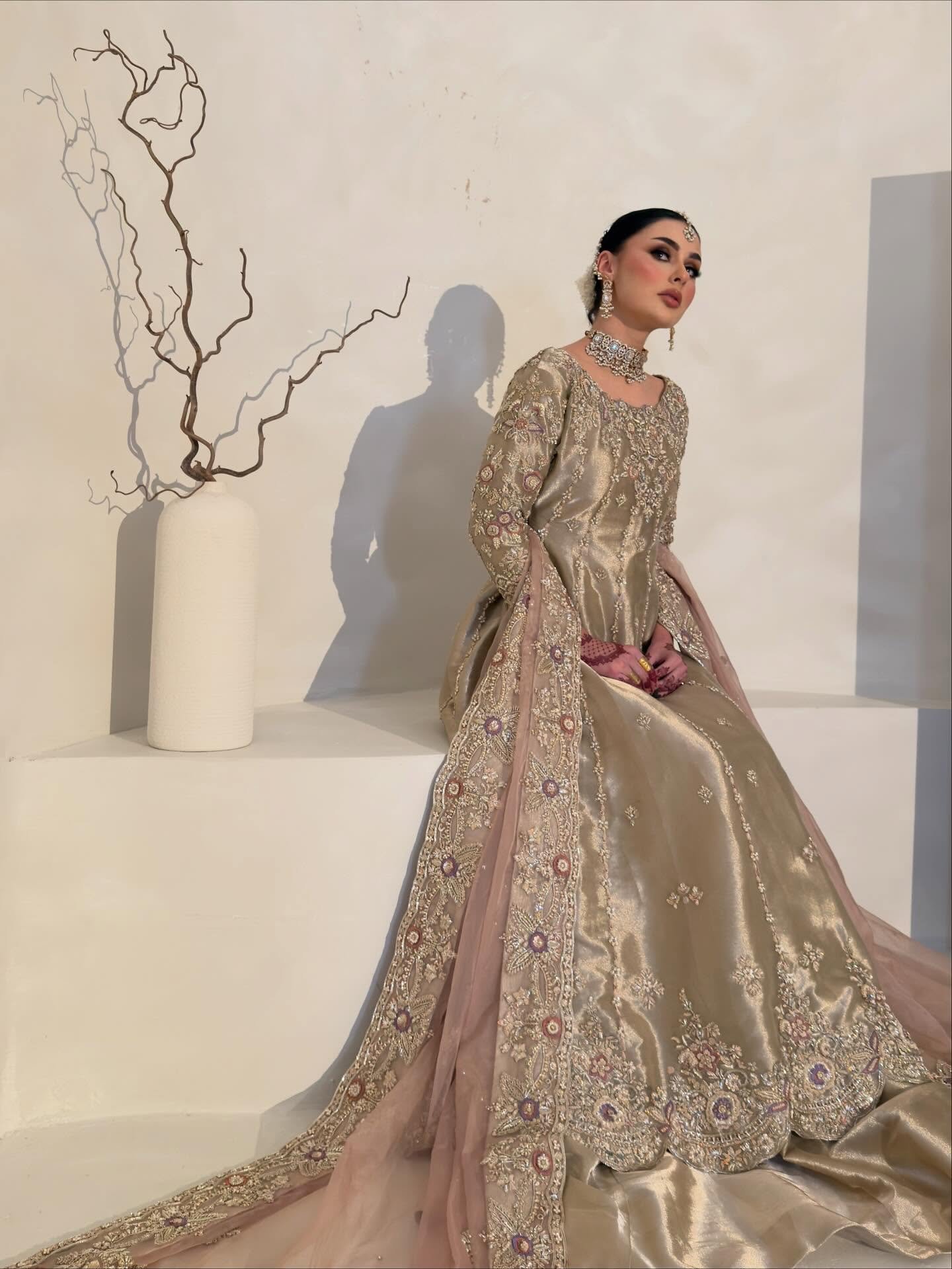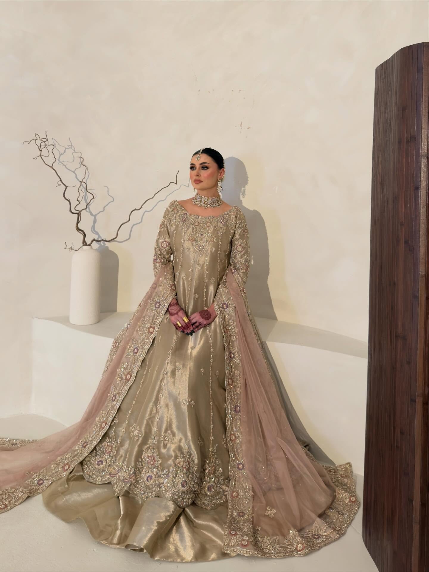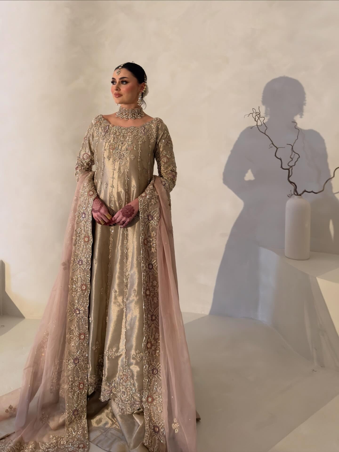This appears to be a formal South Asian (likely Pakistani/Indian) wedding or formal wear ensemble, styled as a Heavy Bridal/Formal Gown, Anarkali, or Kalidar Peshwas.