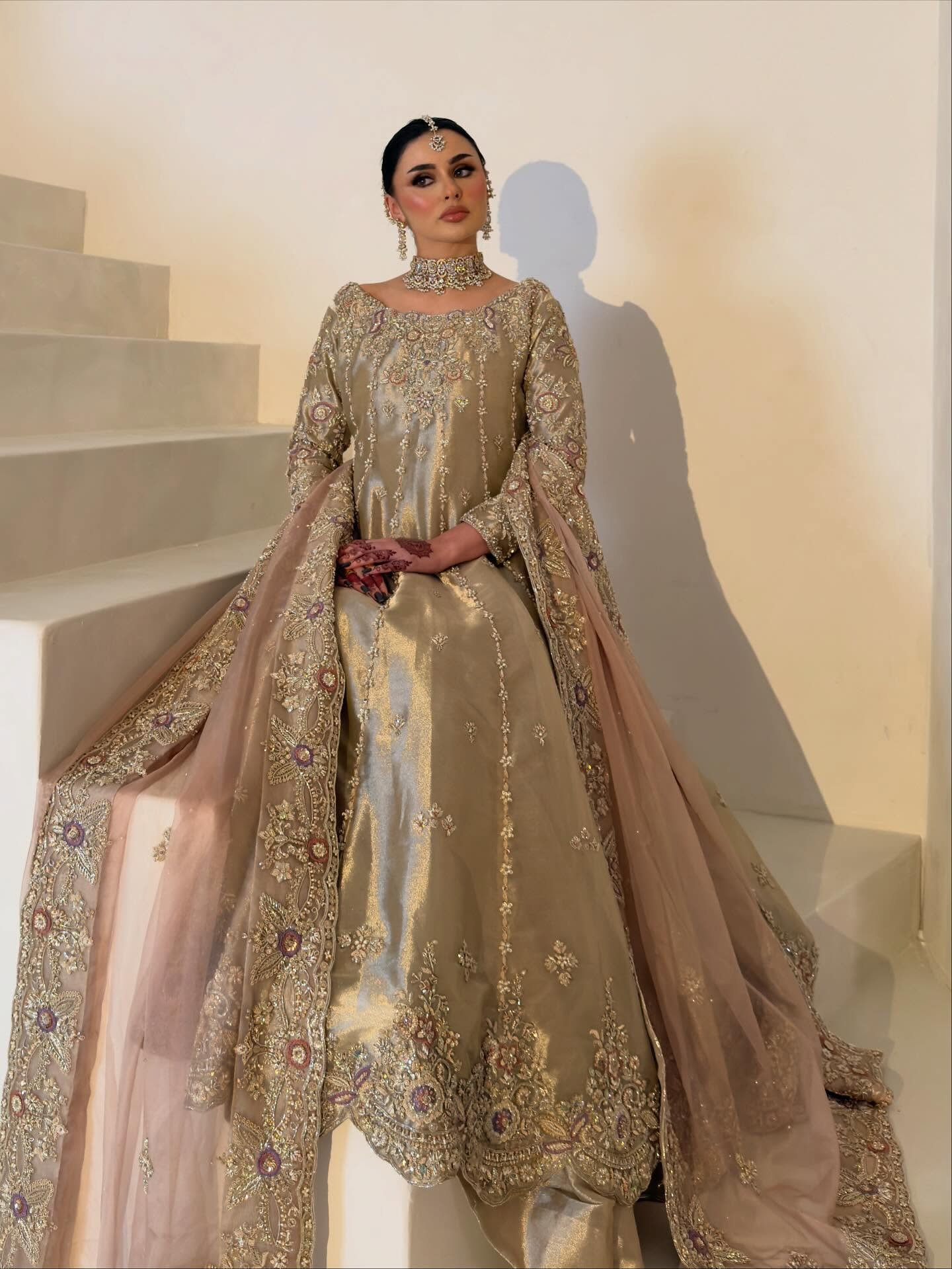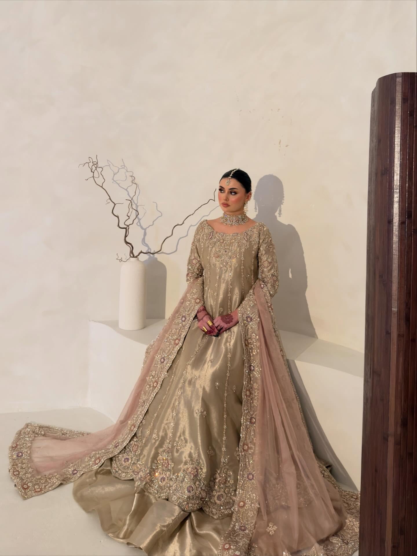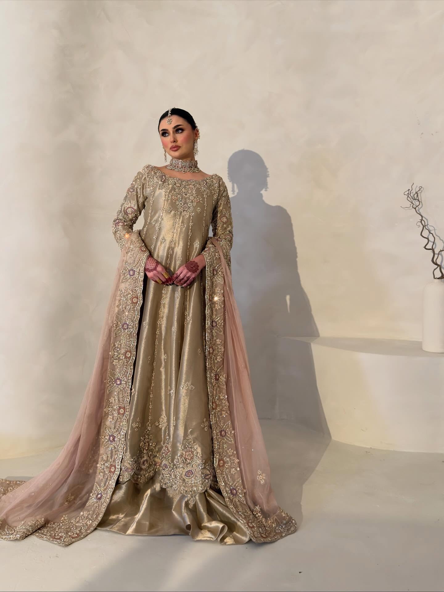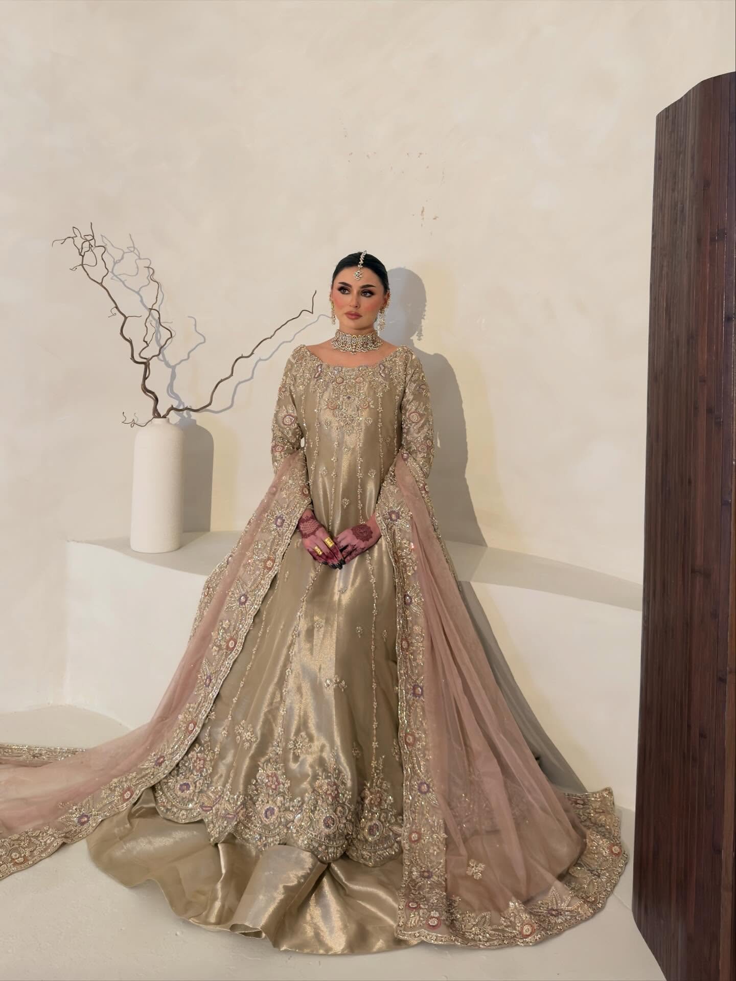 This appears to be a formal South Asian (likely Pakistani/Indian) wedding or formal wear ensemble, styled as a Heavy Bridal/Formal Gown, Anarkali, or Kalidar Peshwas.