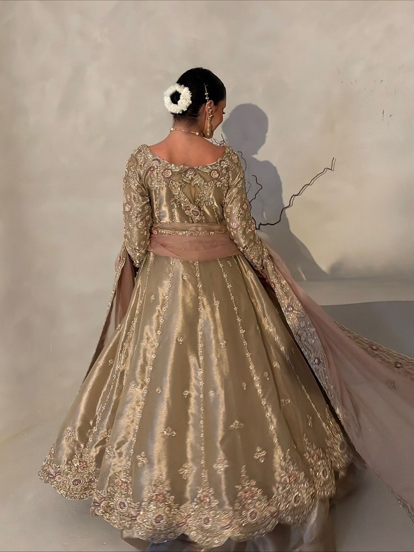 | Fabric | Silk/Brocade, Tissue, or Jamawar for the main gown, giving it a rich texture and voluminous structure. The fabric has a subtle shimmer/lustre. |