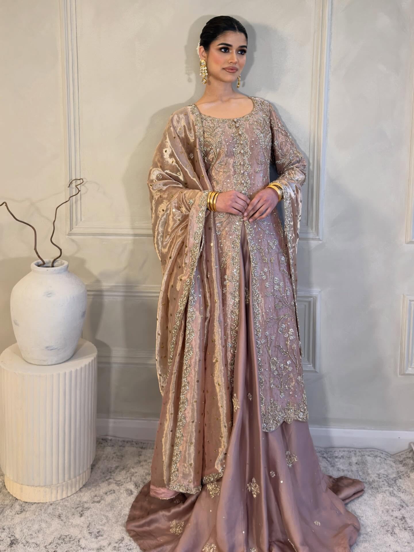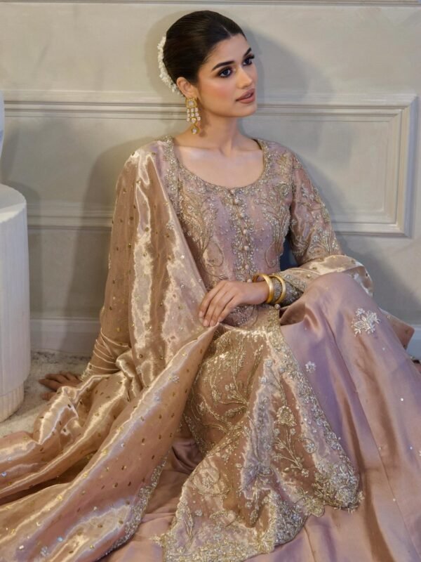 Embroidery: Intricate silver and champagne-gold threadwork, likely incorporating zardozi, dabka, and shimmering sequins or crystals to create a delicate floral pattern along the borders and panels.