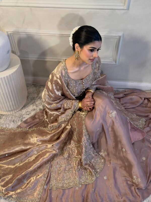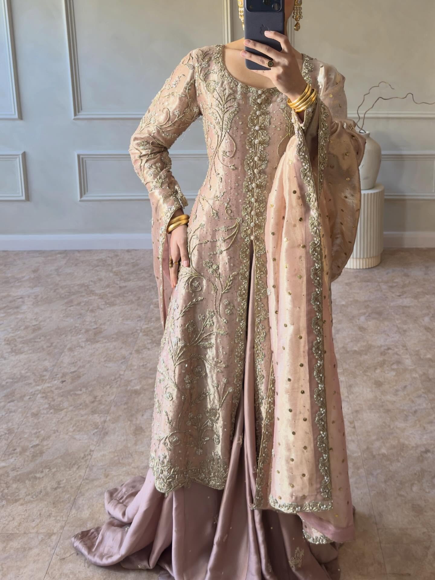 Fabric: The base appears to be a heavy silk or satin, topped with a lighter, sheer organza or net fabric for the jacket and dupatta, providing a nice contrast in texture and weight.