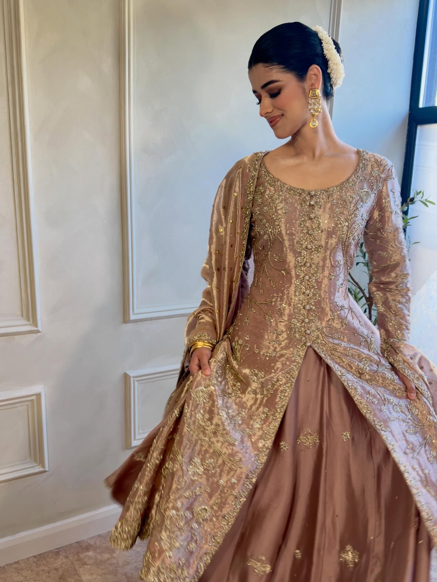 Accessories: The look is paired with traditional gold bangles and classic Jhumka earrings, striking a balance between modern color palettes and traditional styling.