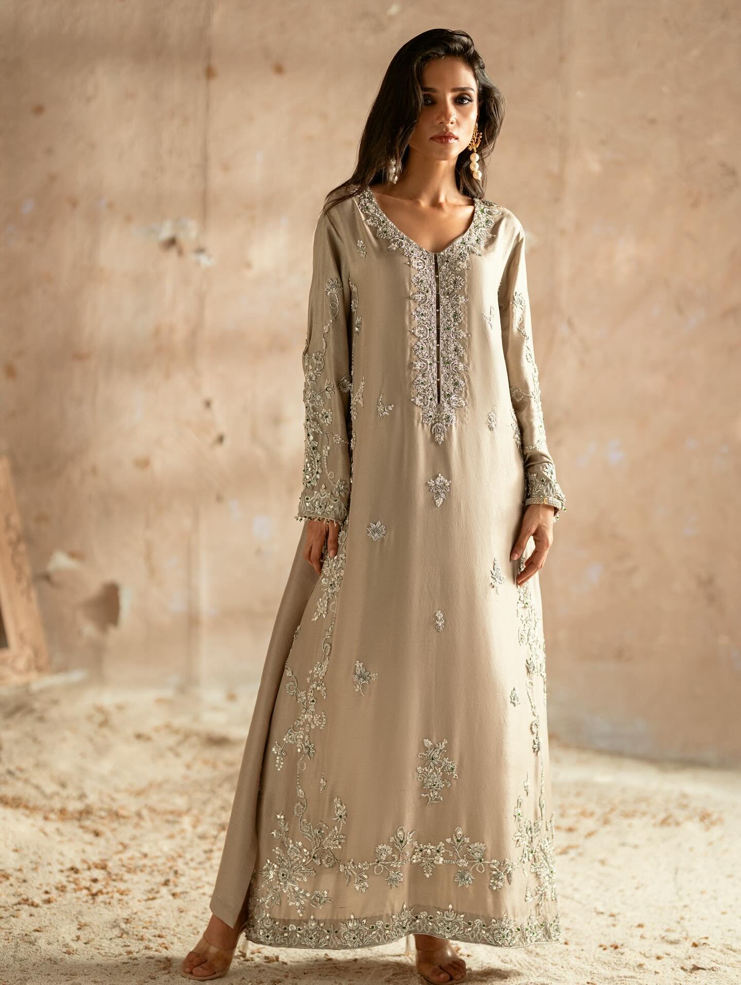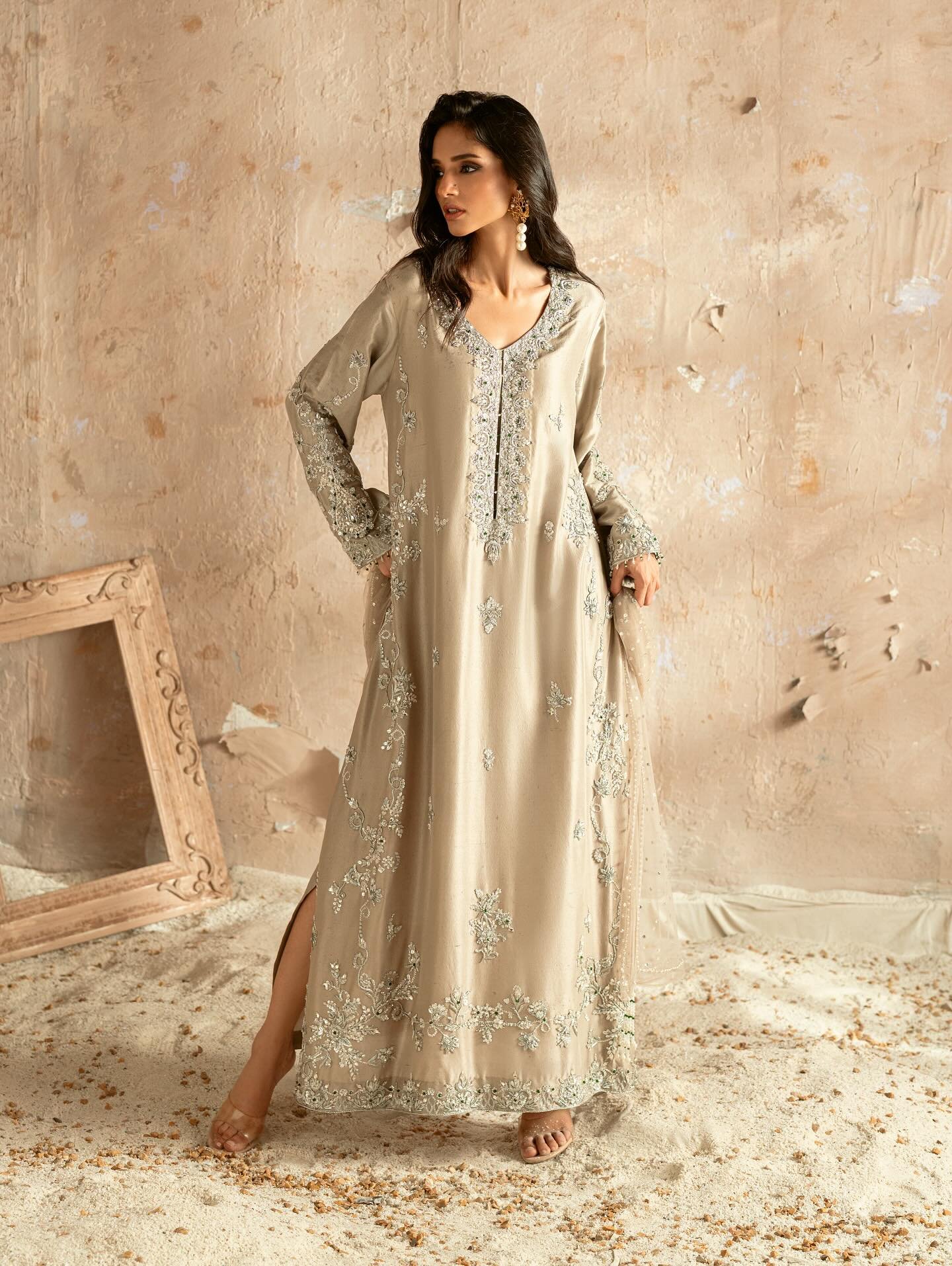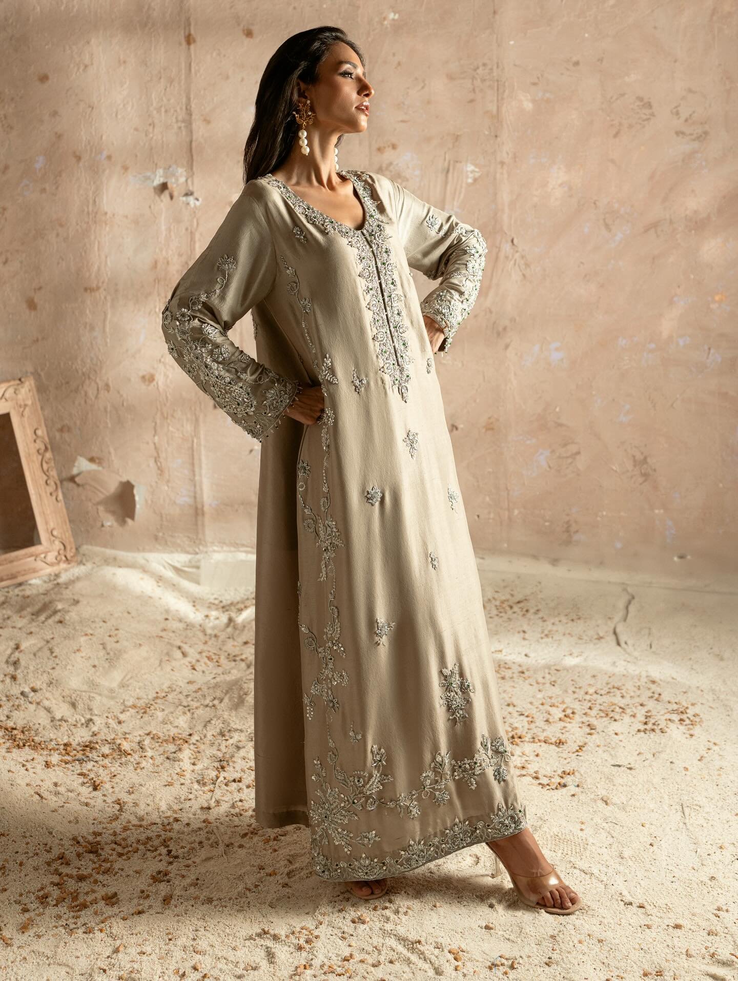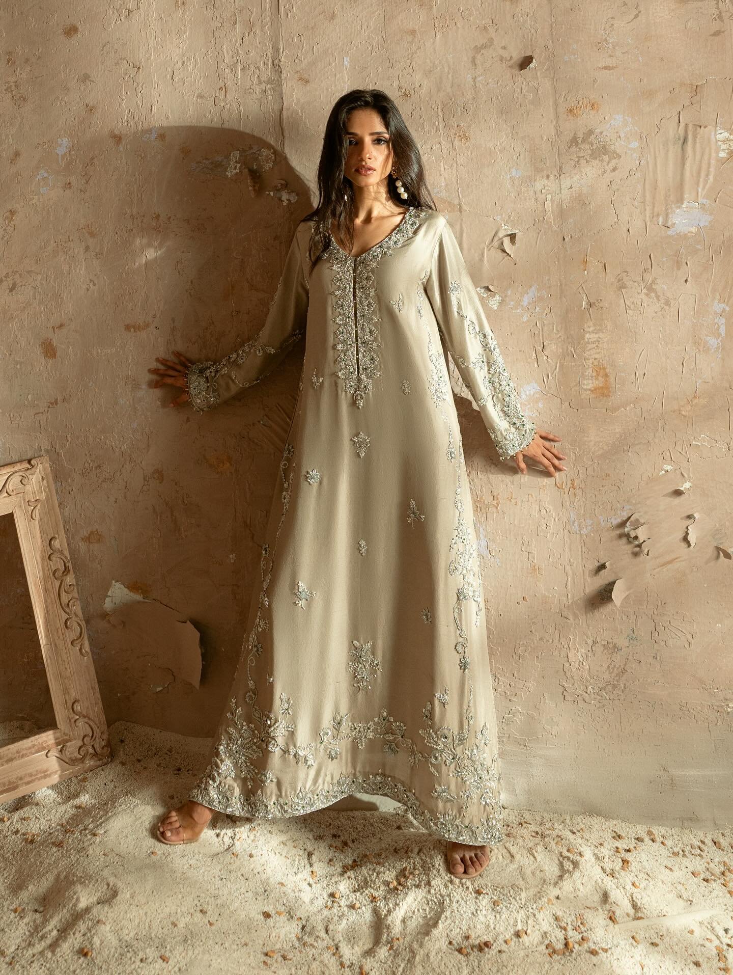 Victoria — A Majestic Long Kaftan Crafted From Pure Raw Silk, Featuring Graceful Embroidery And An Elegant Cutline. With Its Flowing Silhouette And Intricate Detailing, This Ensemble Embodies Timeless Sophistication And Regal Charm